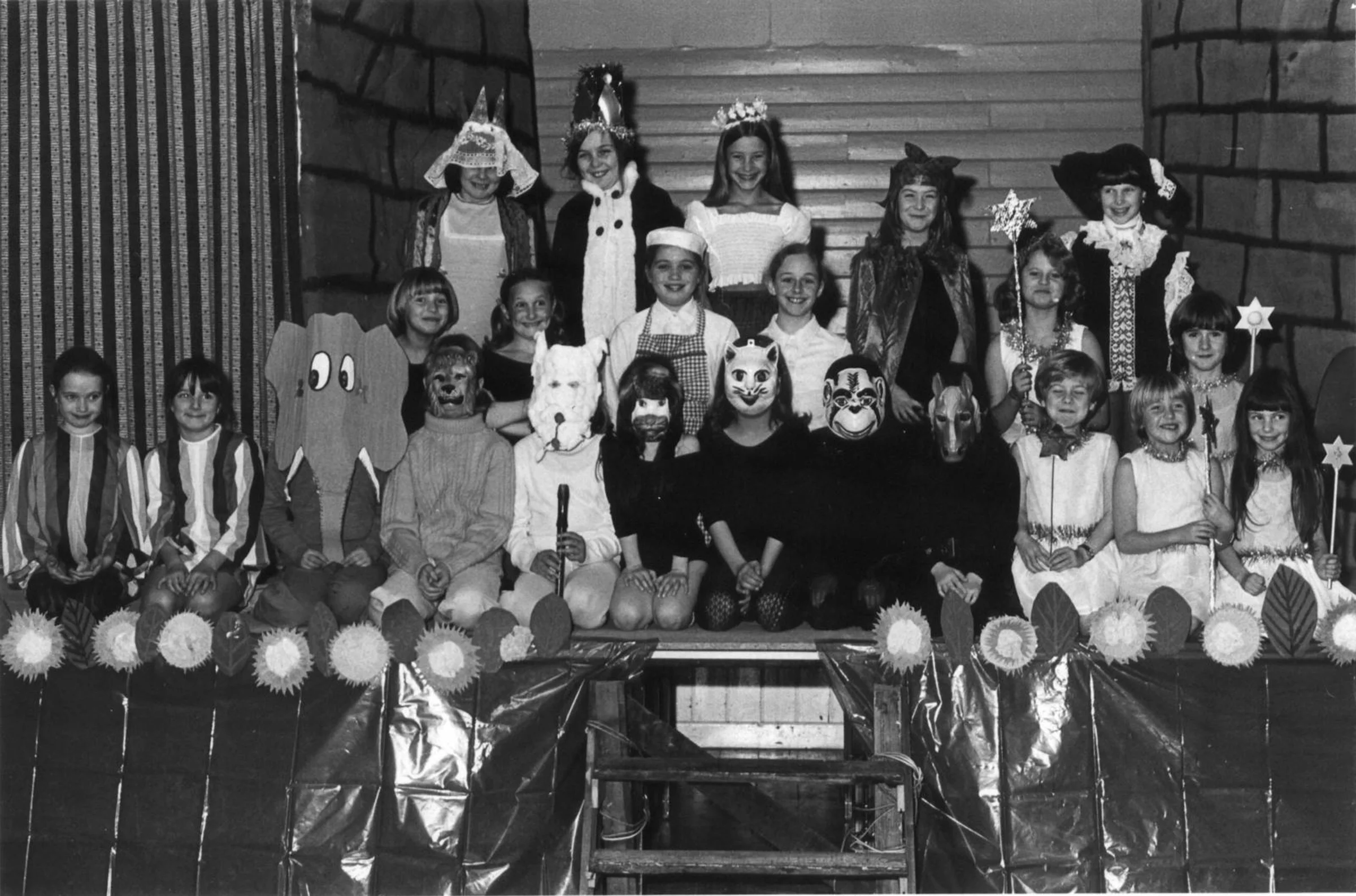A production of the pantomime Sleeping Beauty. The newspaper cutting says this was by the 1st Marks Tey Brownies in the Village Hall. This photo is labelled as 1977.