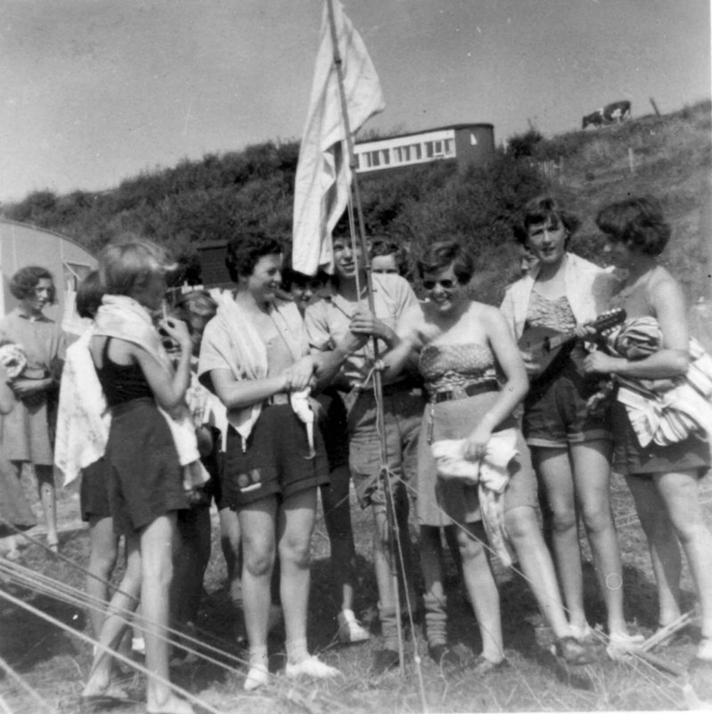 An undated photo of a group of older girls together, maybe near a beach with a gentle cliff behind them. At the top there is a caravan and a cow. The girls are dressed for summer weather and some of them are holding a flag. They could be from Guide companies in Copford or Marks Tey.