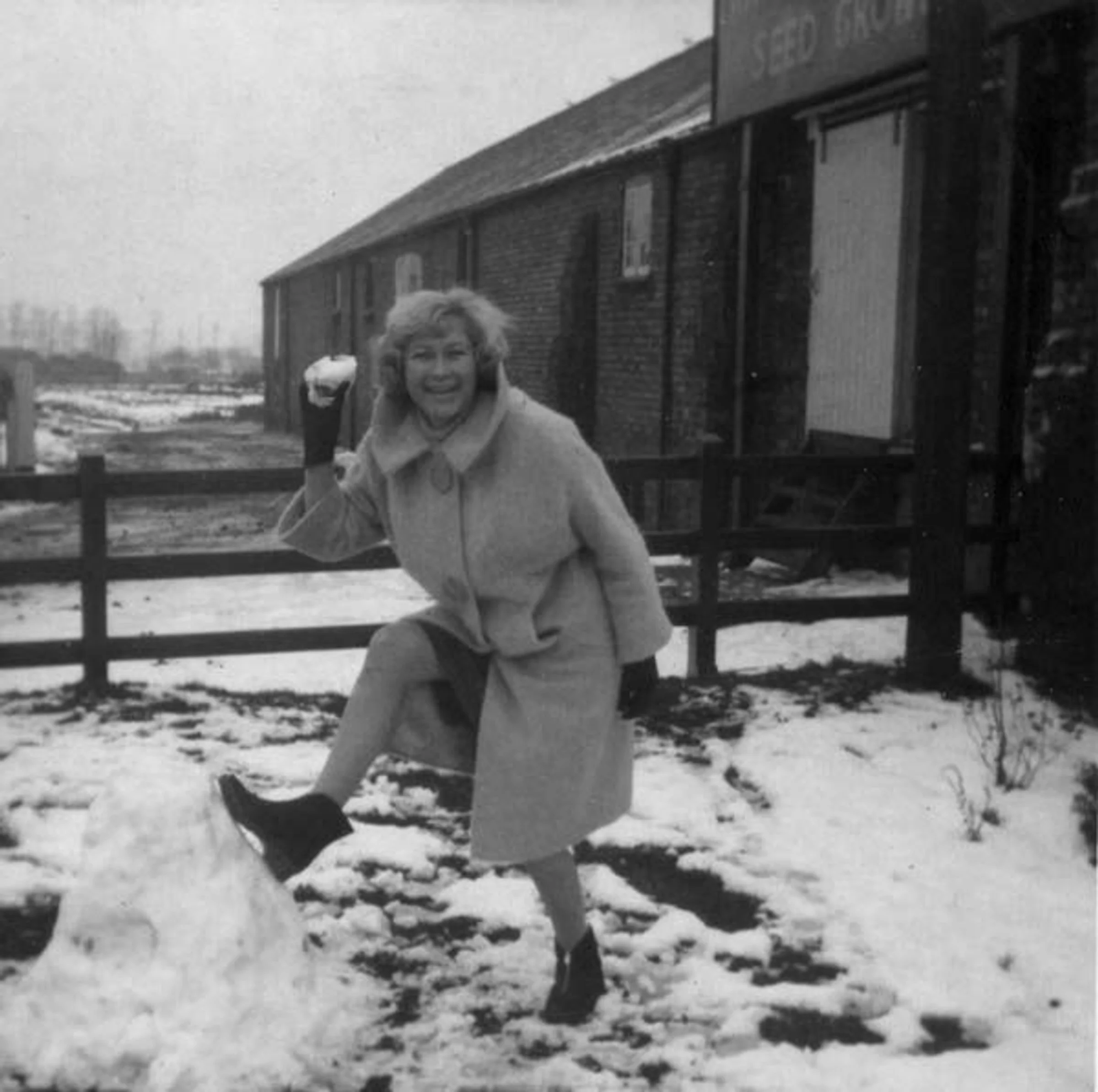 An undated photo of a lady about to throw a snowball outside the old maltings building. The sign above shows that this was when Folkards used the building which was close to the railway station.