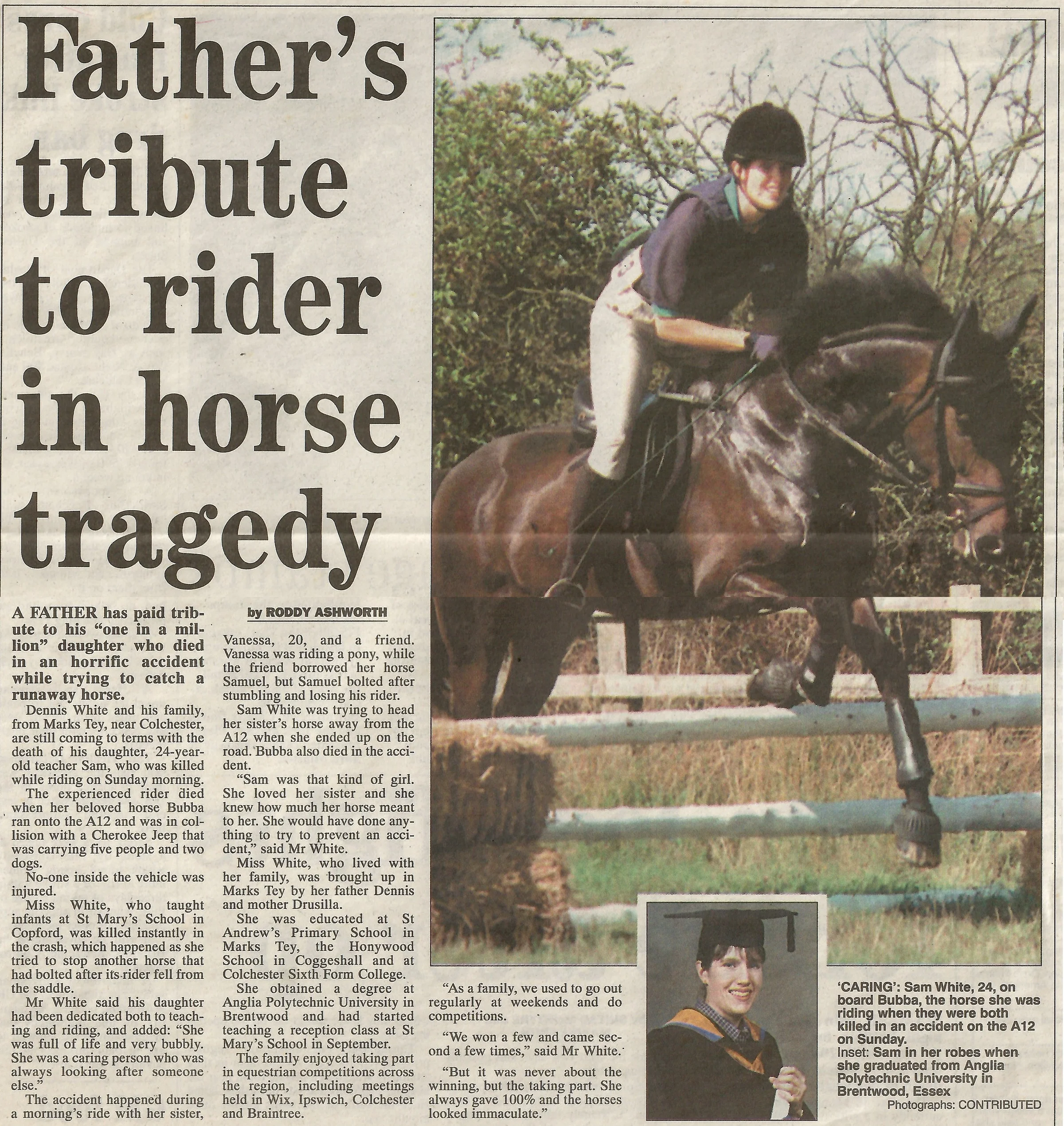 Newspaper photographs and article reporting on Sam White, who died in an accident on the A12.