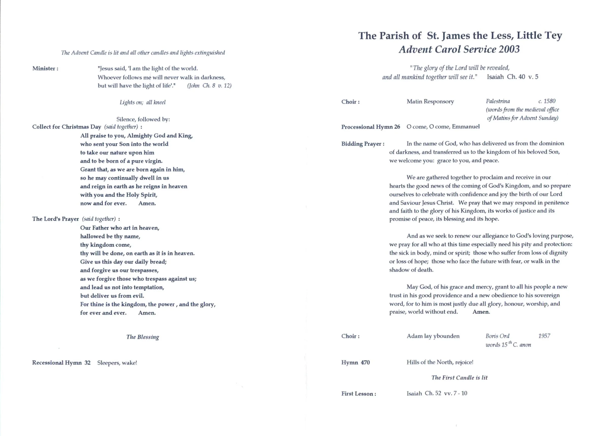 The service sheet for the hymns, readings and prayers at the Advent Carol Service at Little Tey church in 2003.