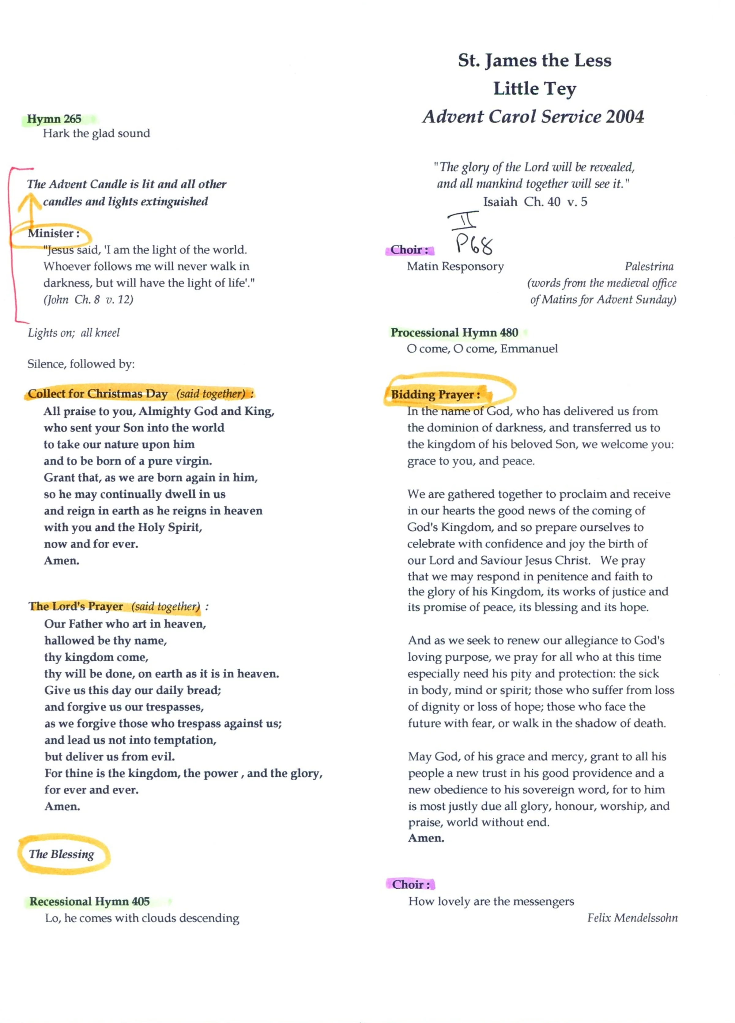 The service sheet for the hymns, readings and prayers at the Advent Carol Service at Little Tey church in 2004.