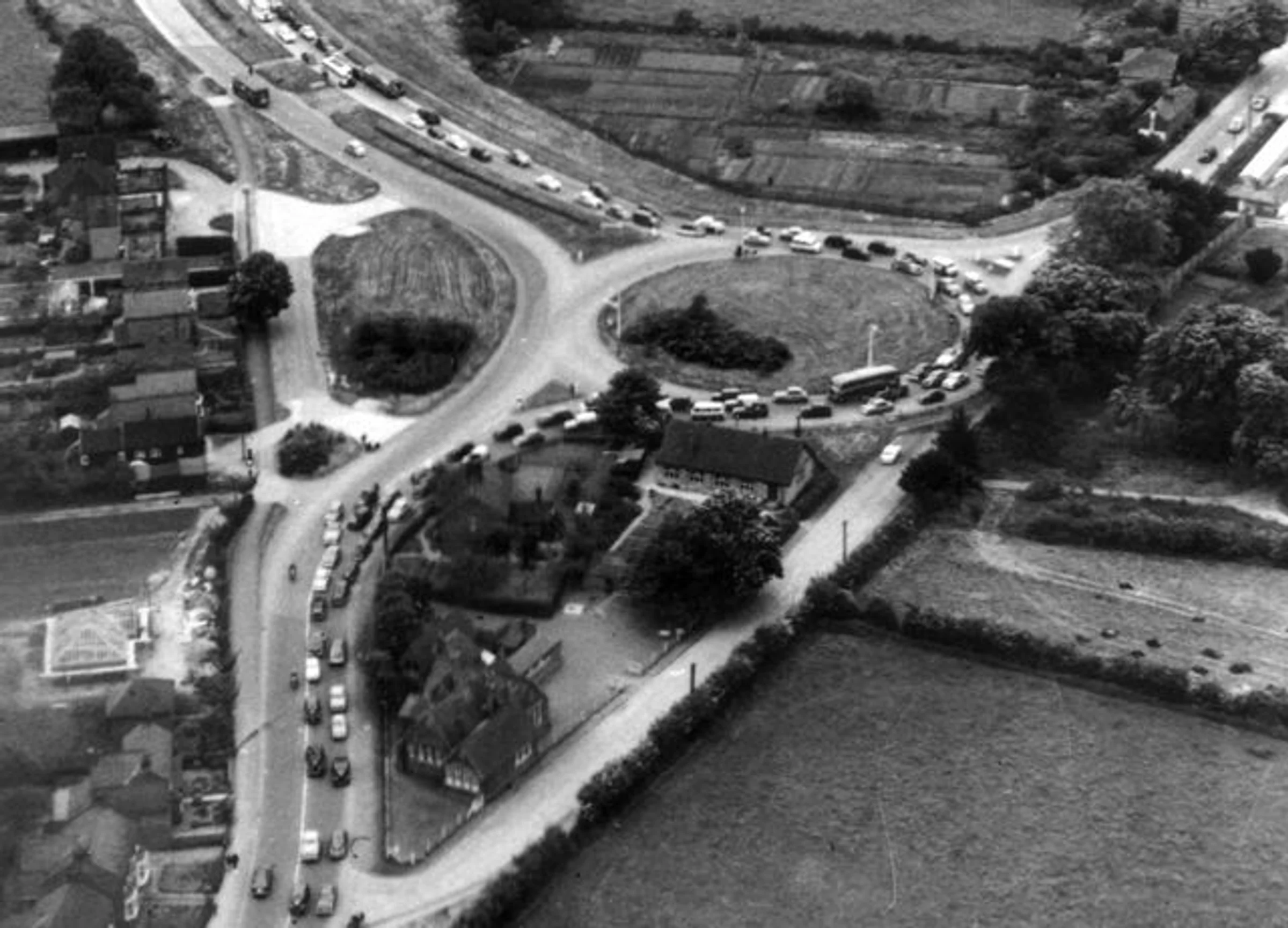 At the top left the dual carriageway traffic comes from London. At the top right Coggeshall Road comes to join a roundabout. The old school building is at the bottom of the photo. Across the road in the bottom left corner would have been the Marks Tey Motor Works. There is not much traffic on the continuation of Coggeshall Road to near the school as it was a dead end. The present Station Road did not exist but would have headed towards the bottom right corner of the photo.