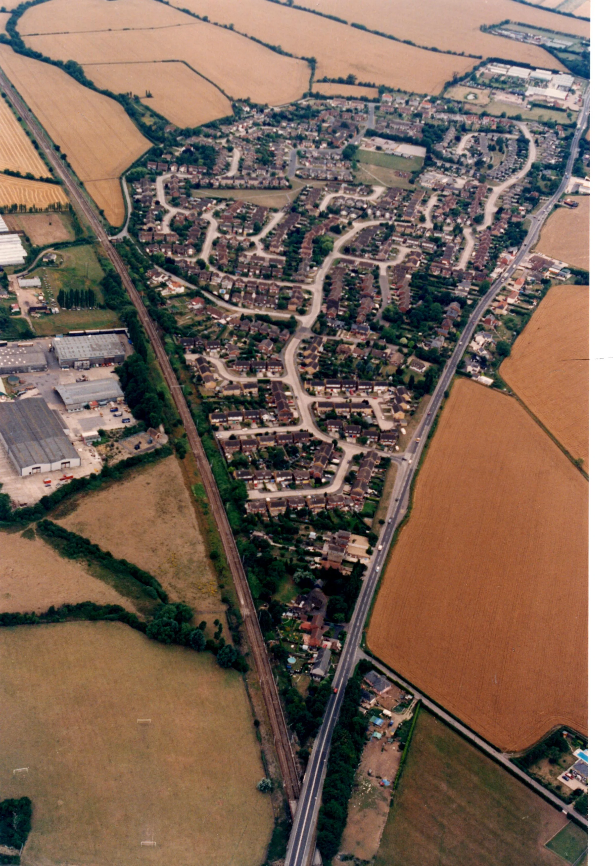 Aerial photo of the estate taken on 13 September 1996. Coggeshall Road (A120) is on the right and the railway line to London is on the left.