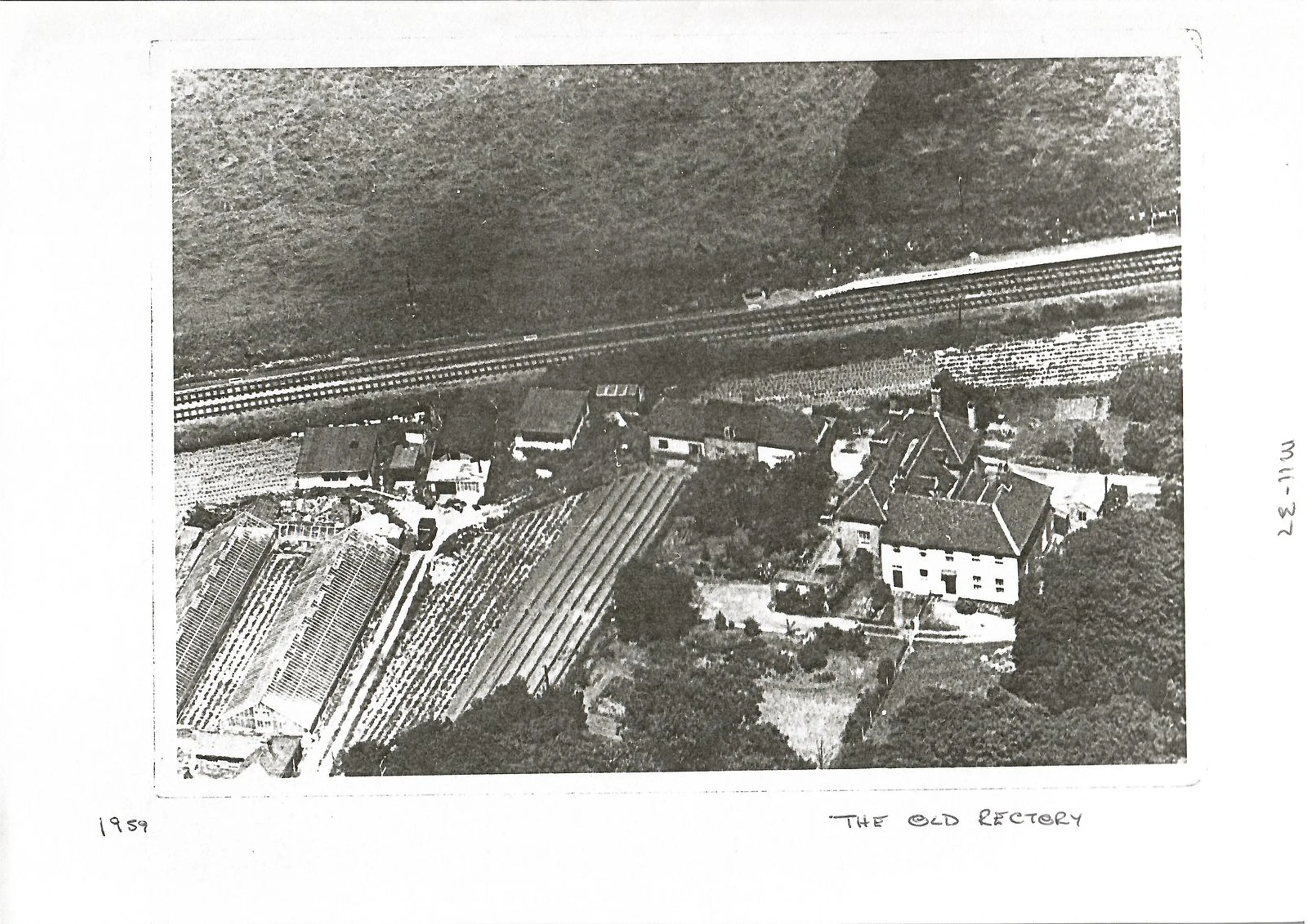 This aerial view looks down on greenhouses, rows of plants at the nursery and buildings that became Flyover Nurseries and may have been originally Buntings. On the right side is the Old Rectory, now Old Rectory Court, and the railway line cuts across the image.