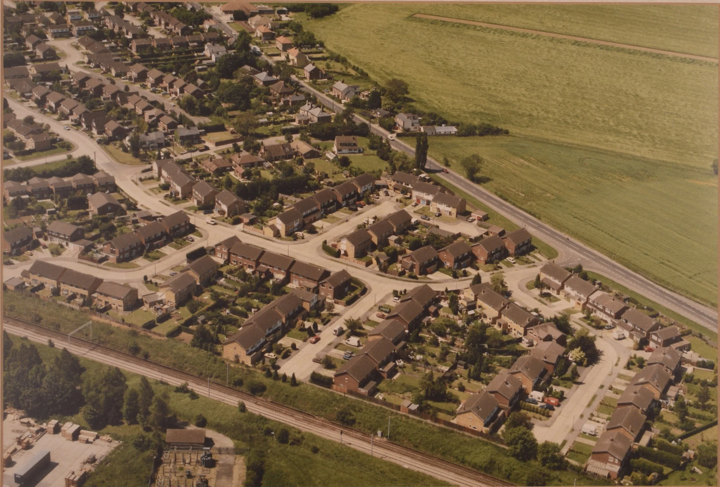 Undated aerial photo of the estate showing the roads around Ashbury Drive. Coggeshall Road (the A120) is towards the top right and the railway line to London is towards the bottom left.