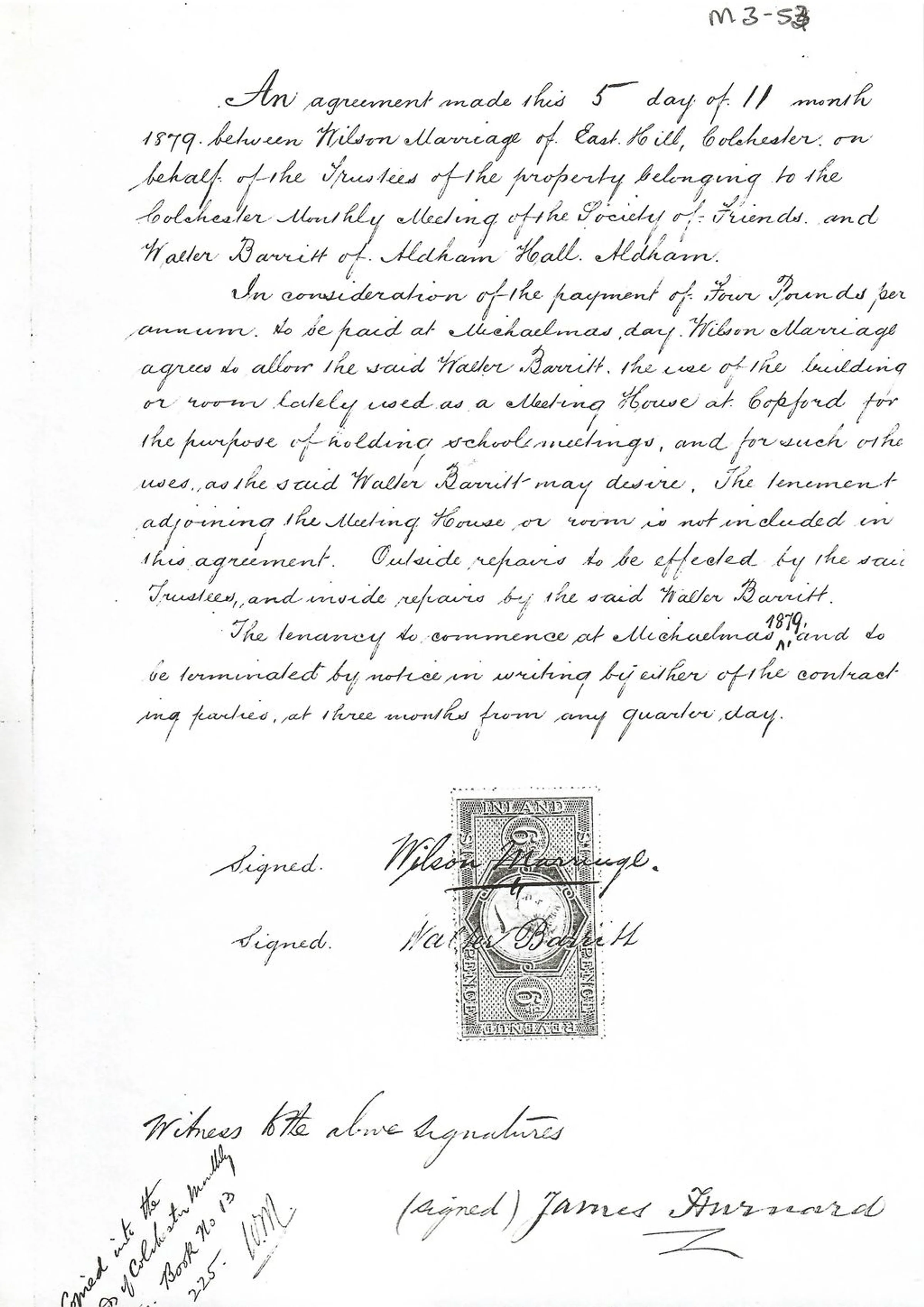 An agreement between Wilson Marriage of the Society of Friends and Walter Barritt of Aldham Hall for the building that had been used as a Meeting House at Copford to be used for school meetings etc. (At that time the position of the Methodist church on London Road was within Copford parish.)