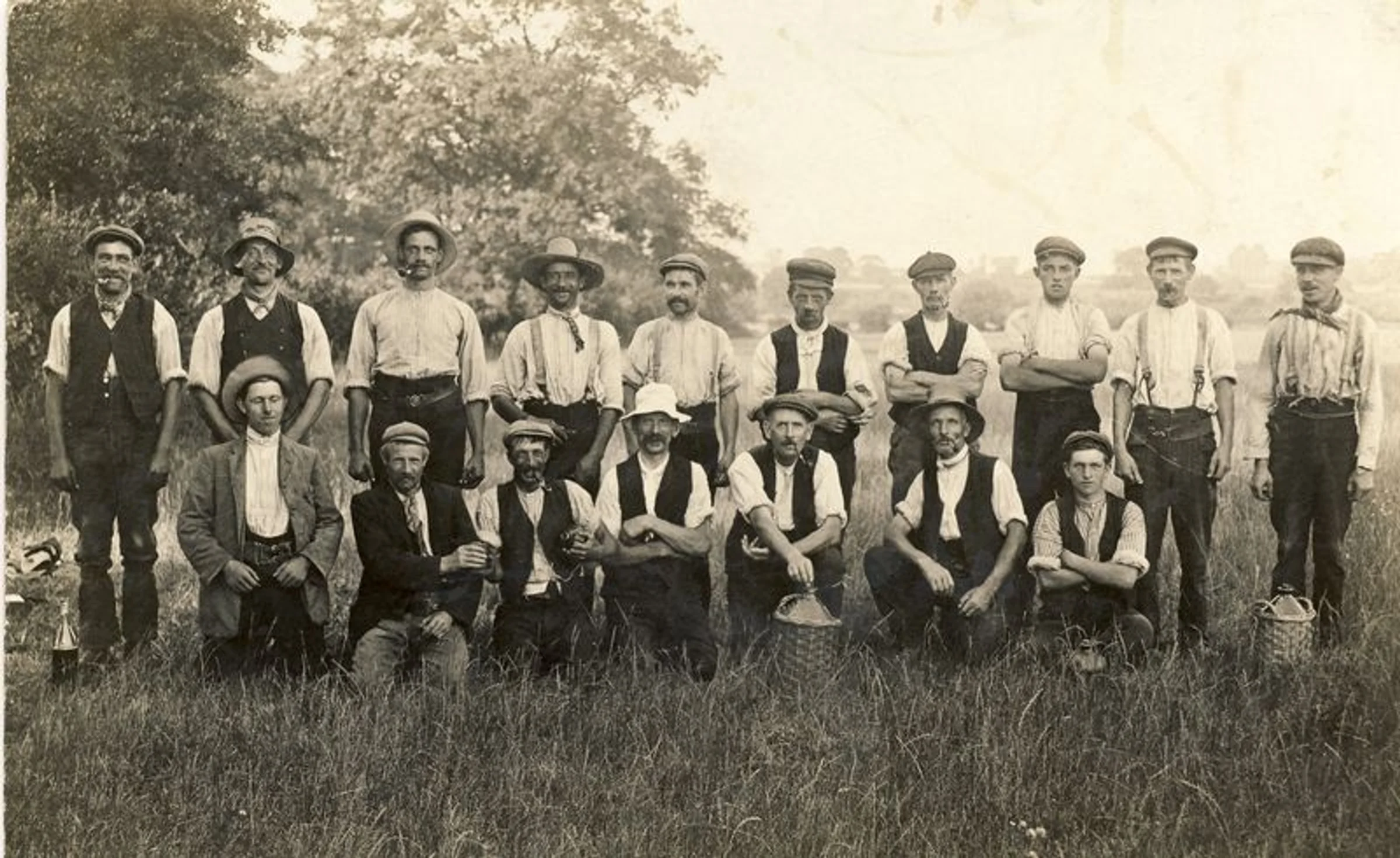 A group of seventeen agricultural workers in shirt sleeves and caps or hats. The photo is not dated and there are no names but it is likely that at least one man is from the Todd family.