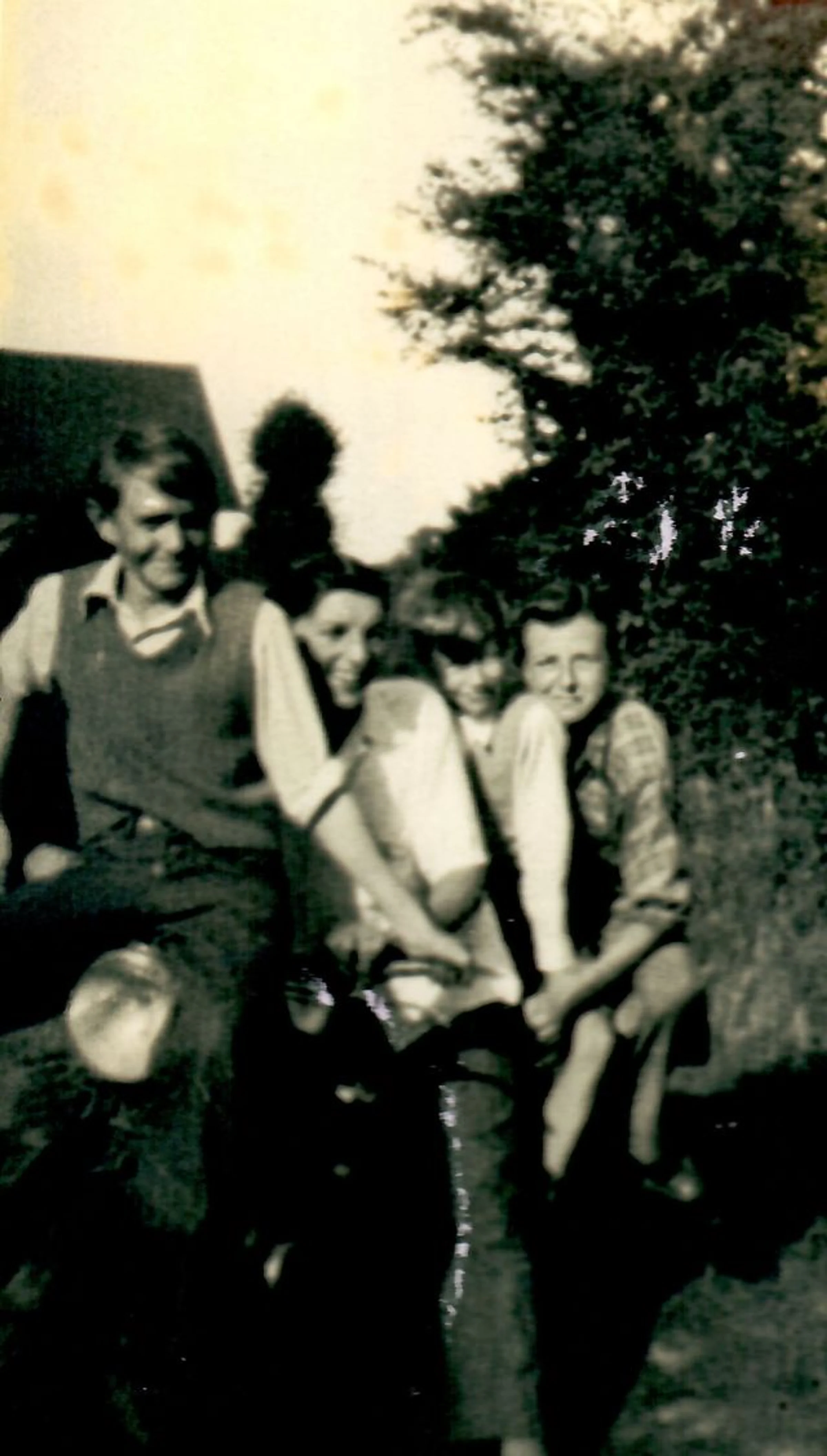 Four lads who appear to be sitting on a motor bike. They are Alan Mattin, Jim Clarke, David Richer and Roy Osborne.