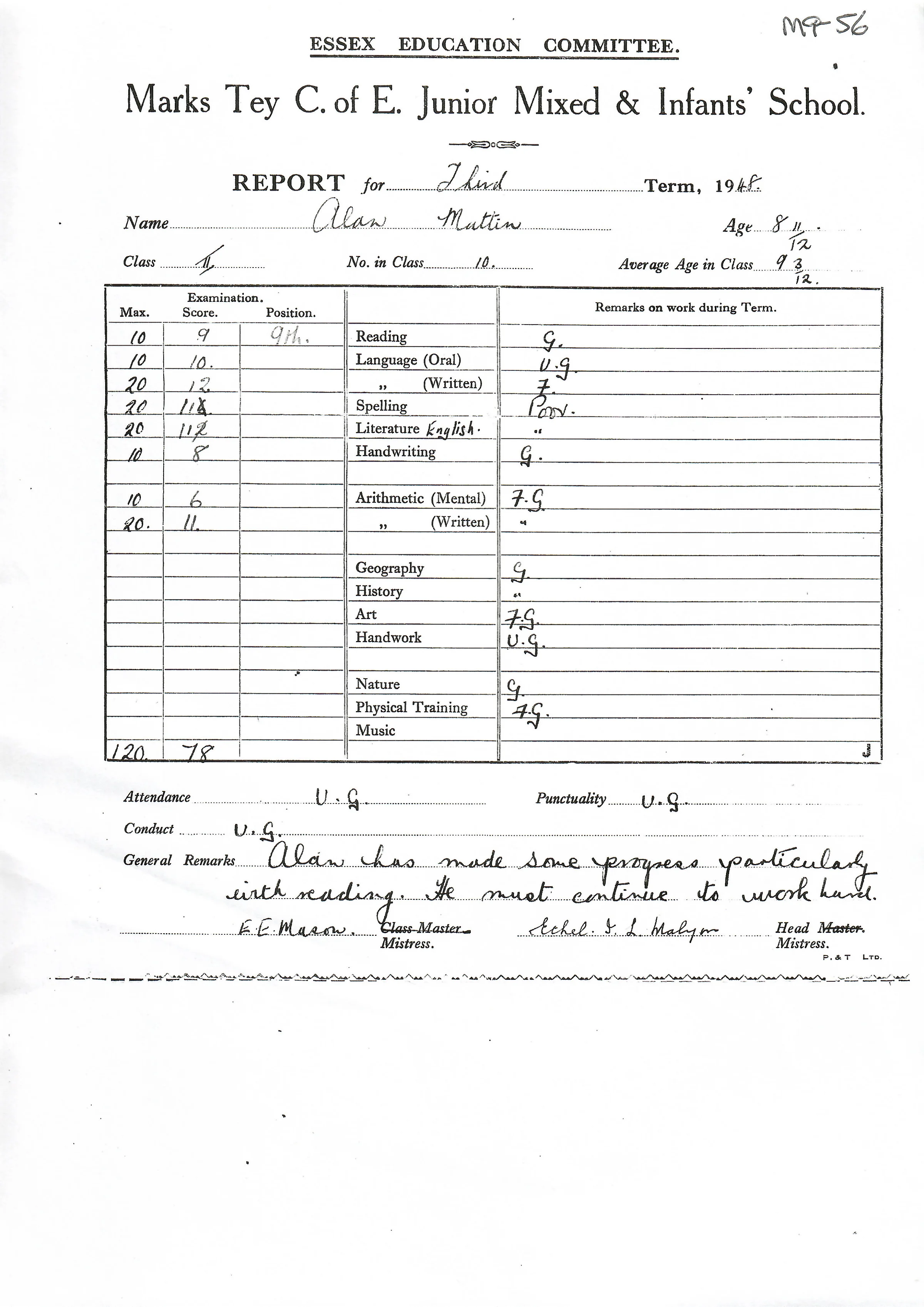 Report card from Marks Tey C of E Junior Mixed & Infants school for Alan Mattin, aged 8 and 11/12, in 1948.