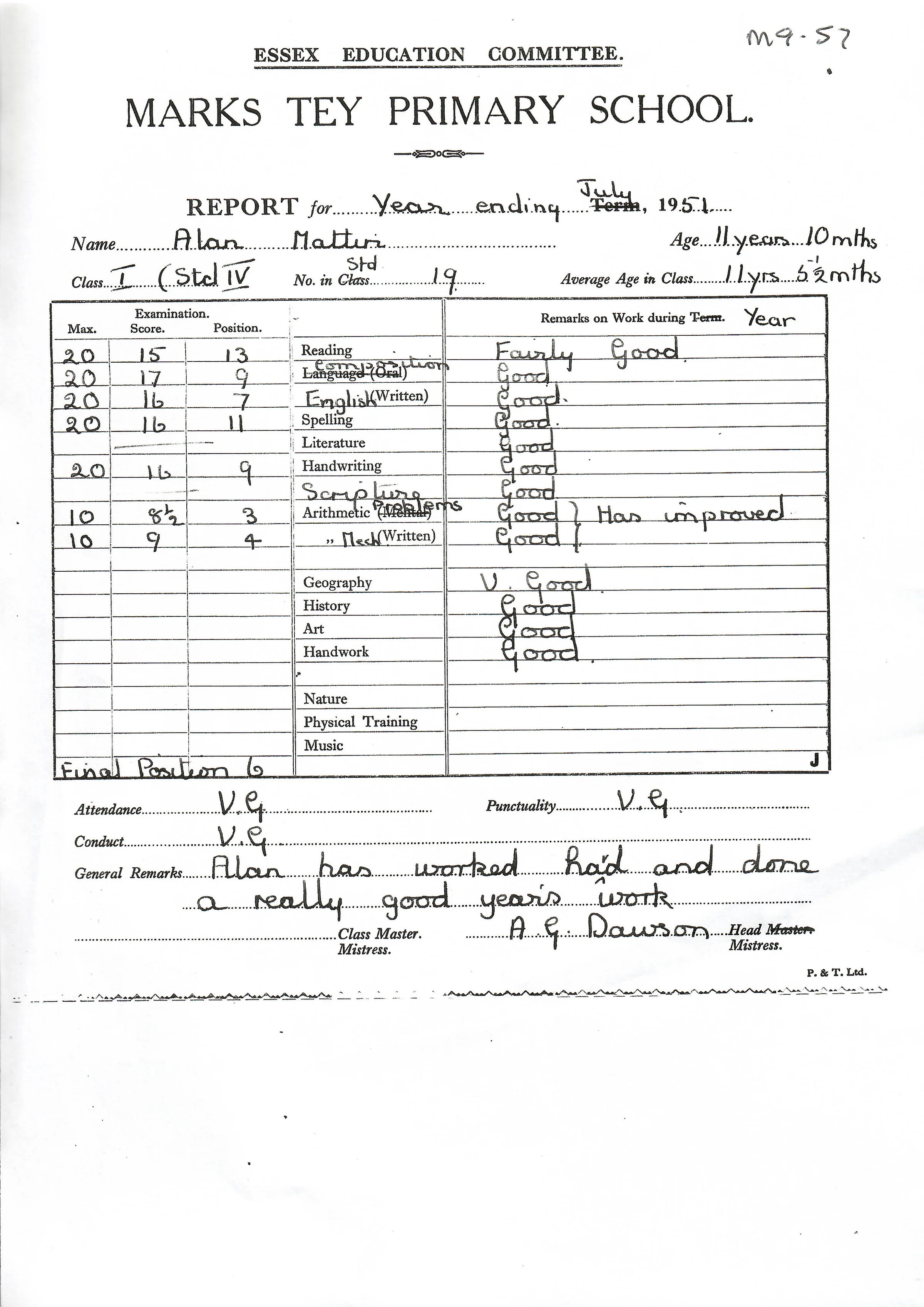 Report card from Marks Tey Primary School for Alan Mattin, aged 11 years, 1951.