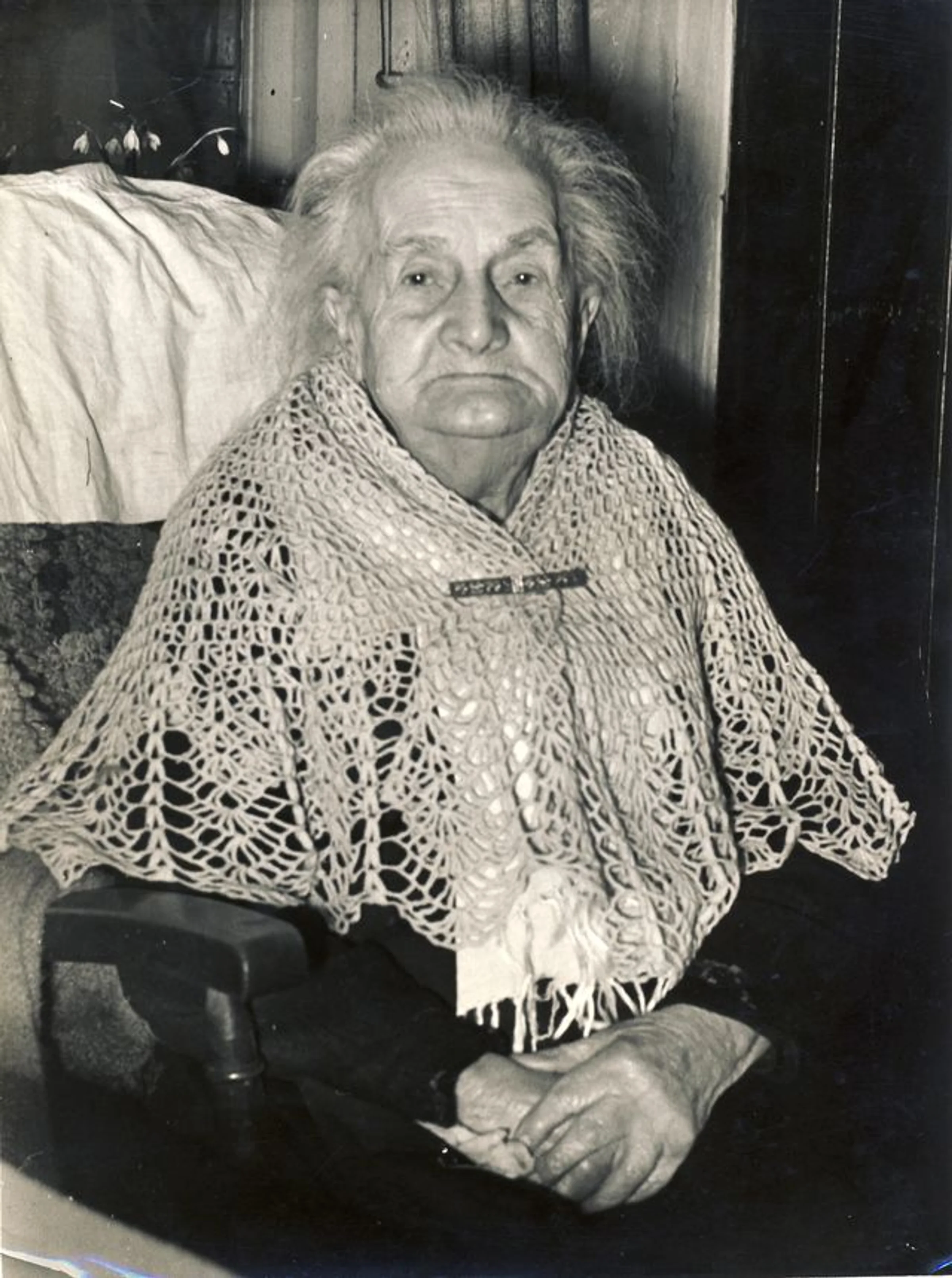 Alice Todd, an elderly lady in an armchair wearing a lacy shawl, widow of Thomas Freeman Todd. She is approaching her 100th birthday.