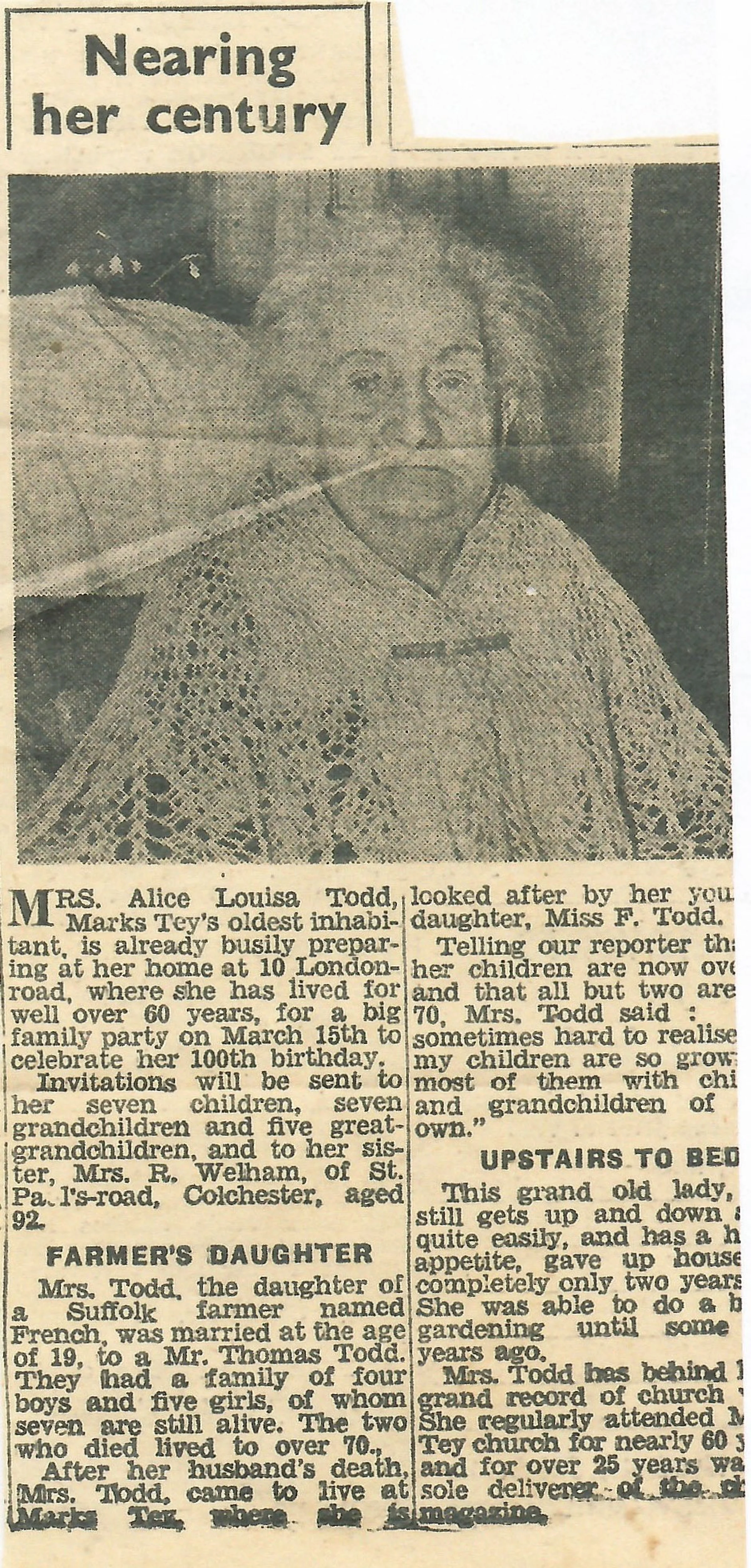 Originally from Suffolk, Alice Louisa Todd has lived at 10 London Road for over 60 years. She is Marks Tey's oldest resident and is preparing for a family party on 15 March to celebrate her 100th birthday.