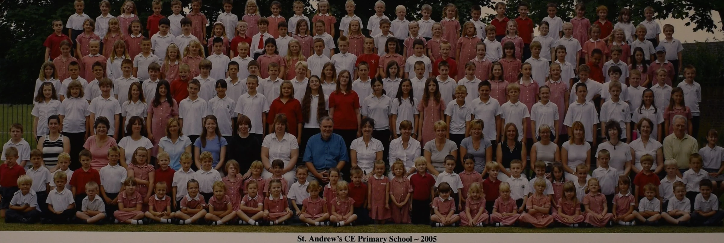 A photo of all pupils and staff at Marks Tey Primary School in 2005. It looks as though Steve Cudmore (wearing a blue shirt) was headteacher.