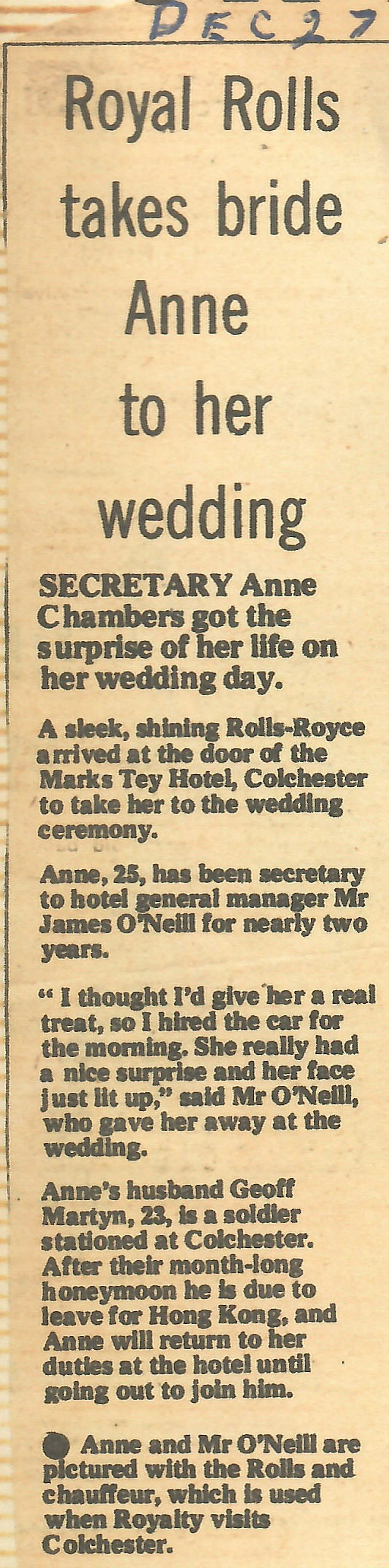 Secretary Anne Chambers got the surprise of her life on her wedding day. A sleek shining Rolls-Royce arrived at the door of the Marks Tey Hotel to take her to the wedding ceremony. Anne, 25, has been secretary to hotel general manager James O'Neill for nearly two years. Etc.