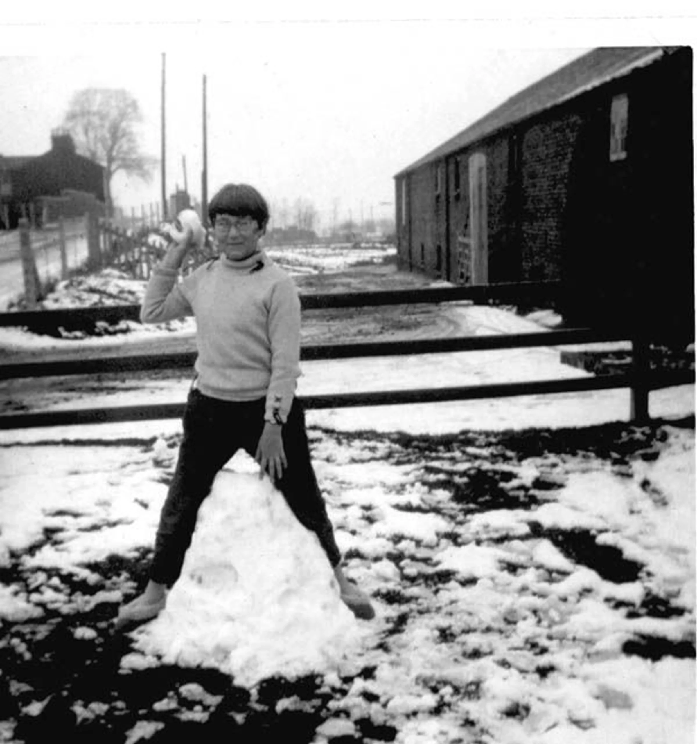 Another person ready for a snowball fight next to the old maltings used by Folkards seeds.