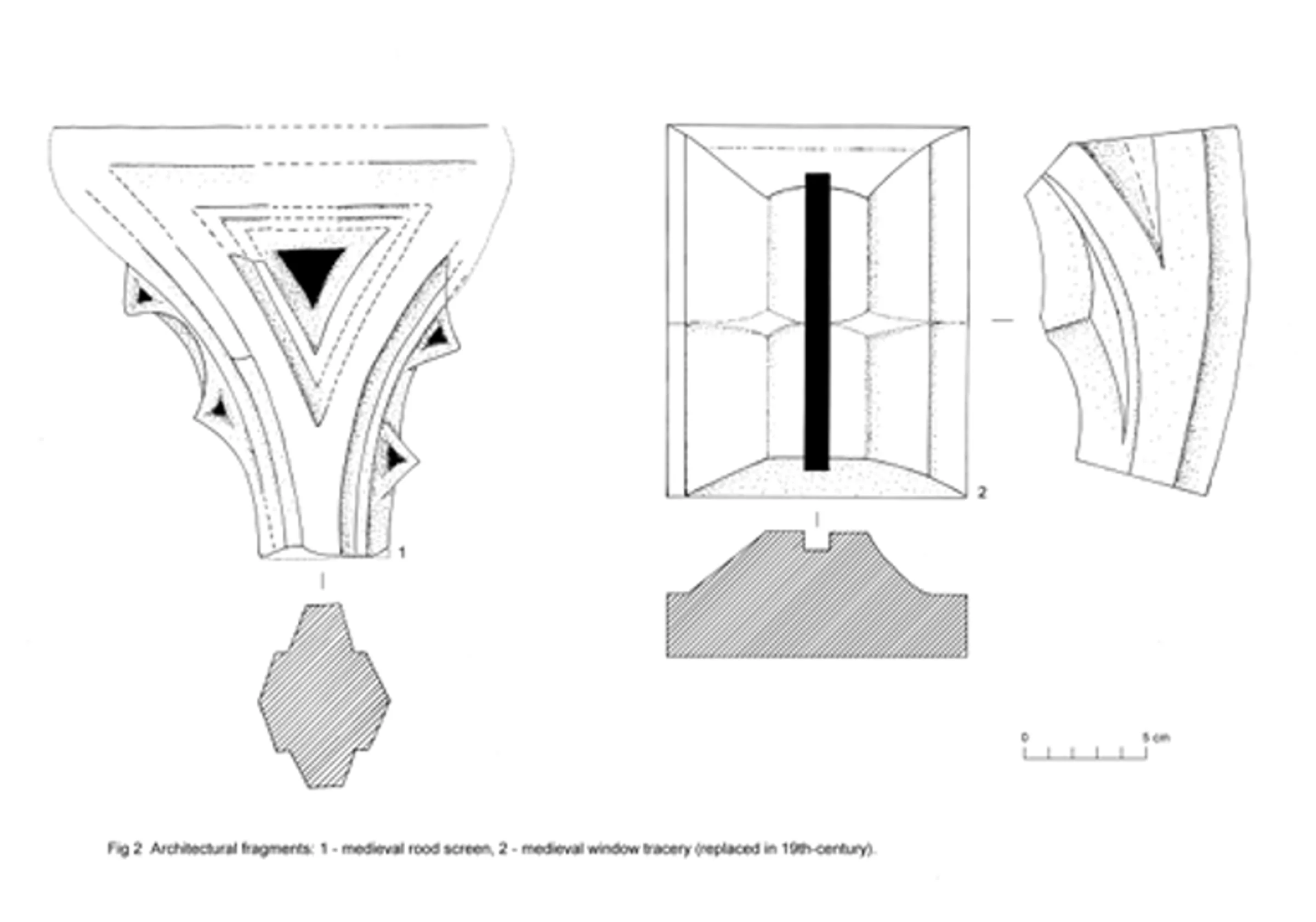 Fig 2 Architectural fragments: 1 - medieval rood screen, 2 - medieval window tracery (replaced in 19th-century).