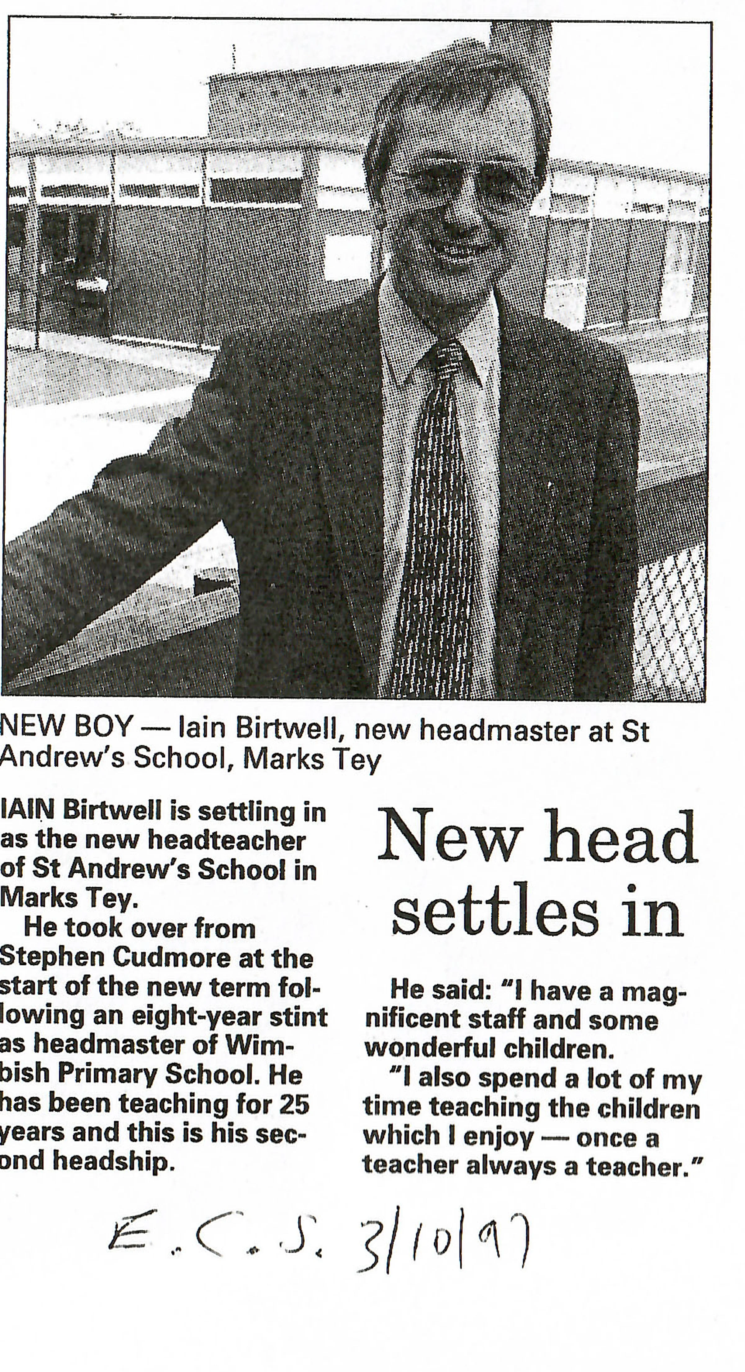 The newspaper clipping reports the appointment and arrival of the new Headteacher, Iain Birtwell at St Andrew’s School, Marks Tey.