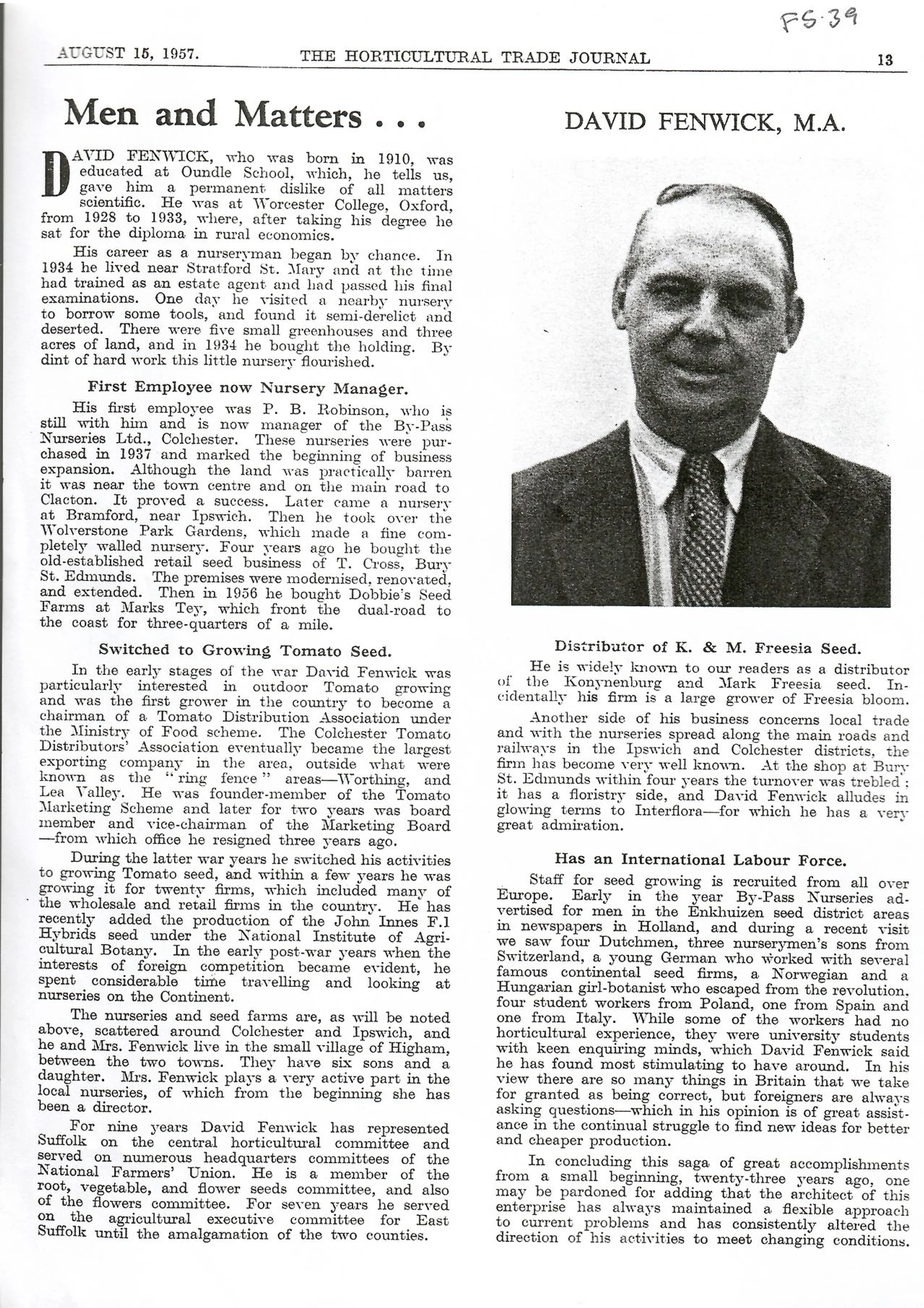 A page with photograph about the career of David Fenwick who bought Dobbies in 1956 and named it By-pass Nurseries.