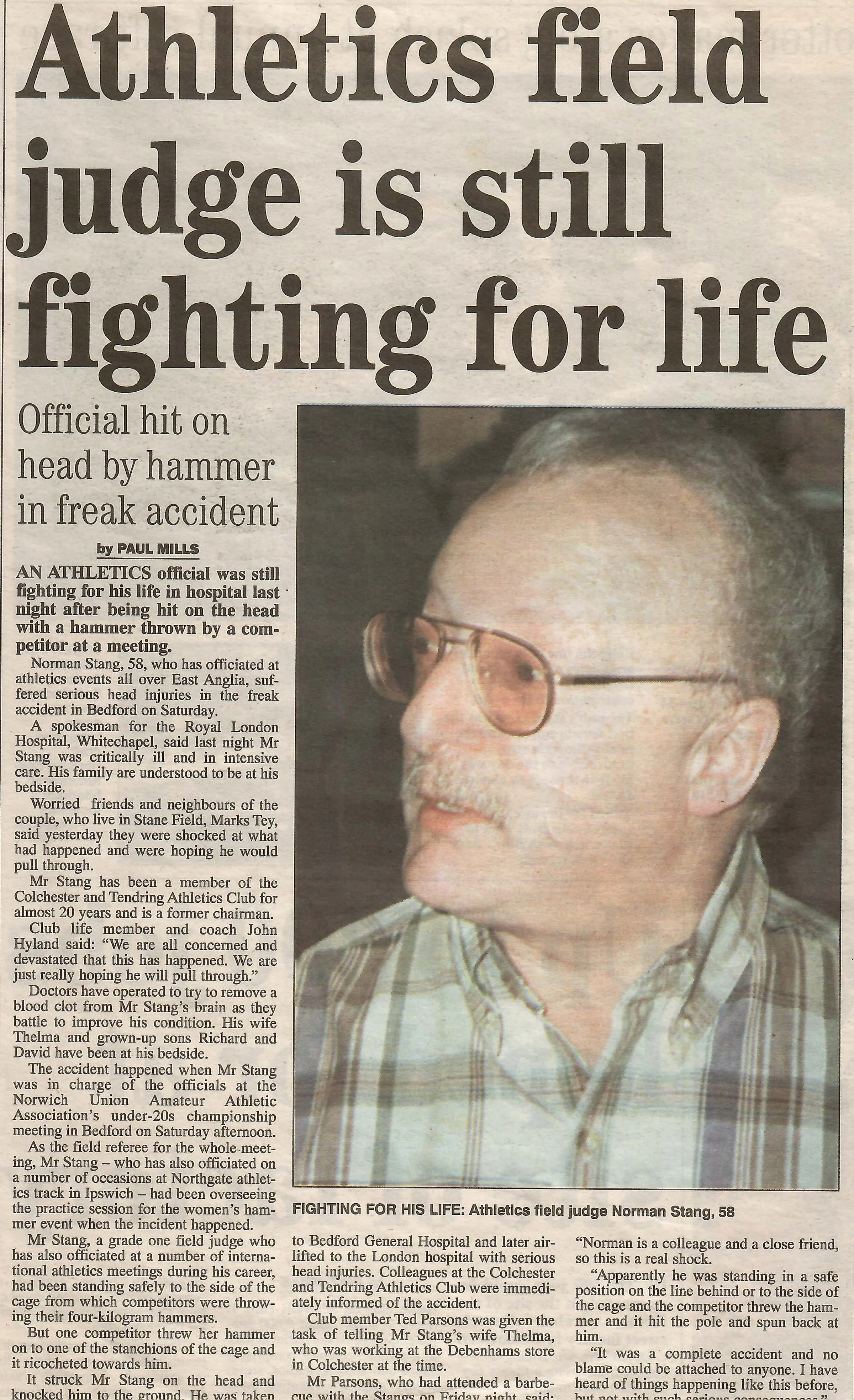 Newspaper photograph and report regarding an accident at an athletics meeting, where Norman Stang was injured.
