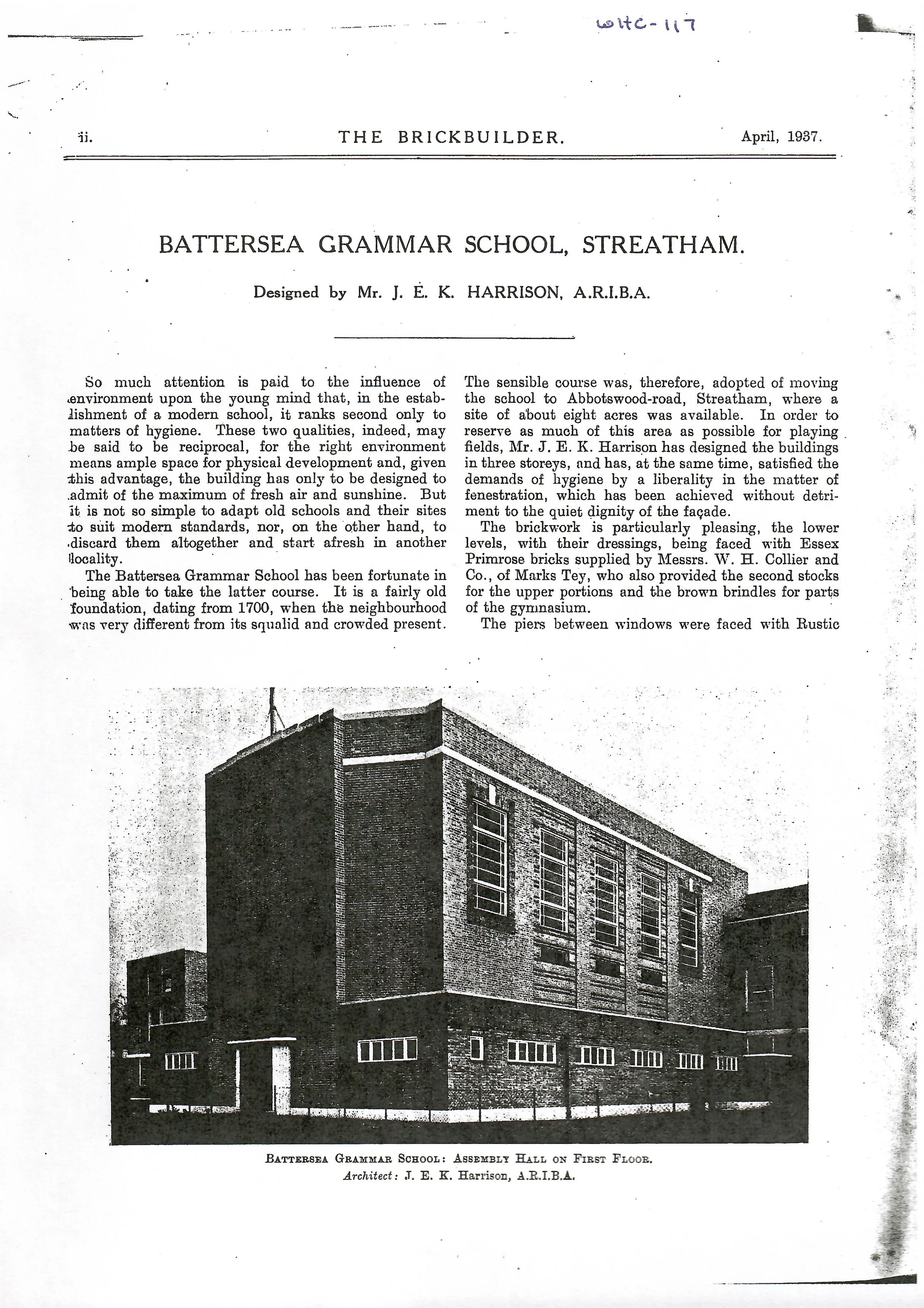 Article describing the new Grammar School at Battersea, built using W H Collier products.