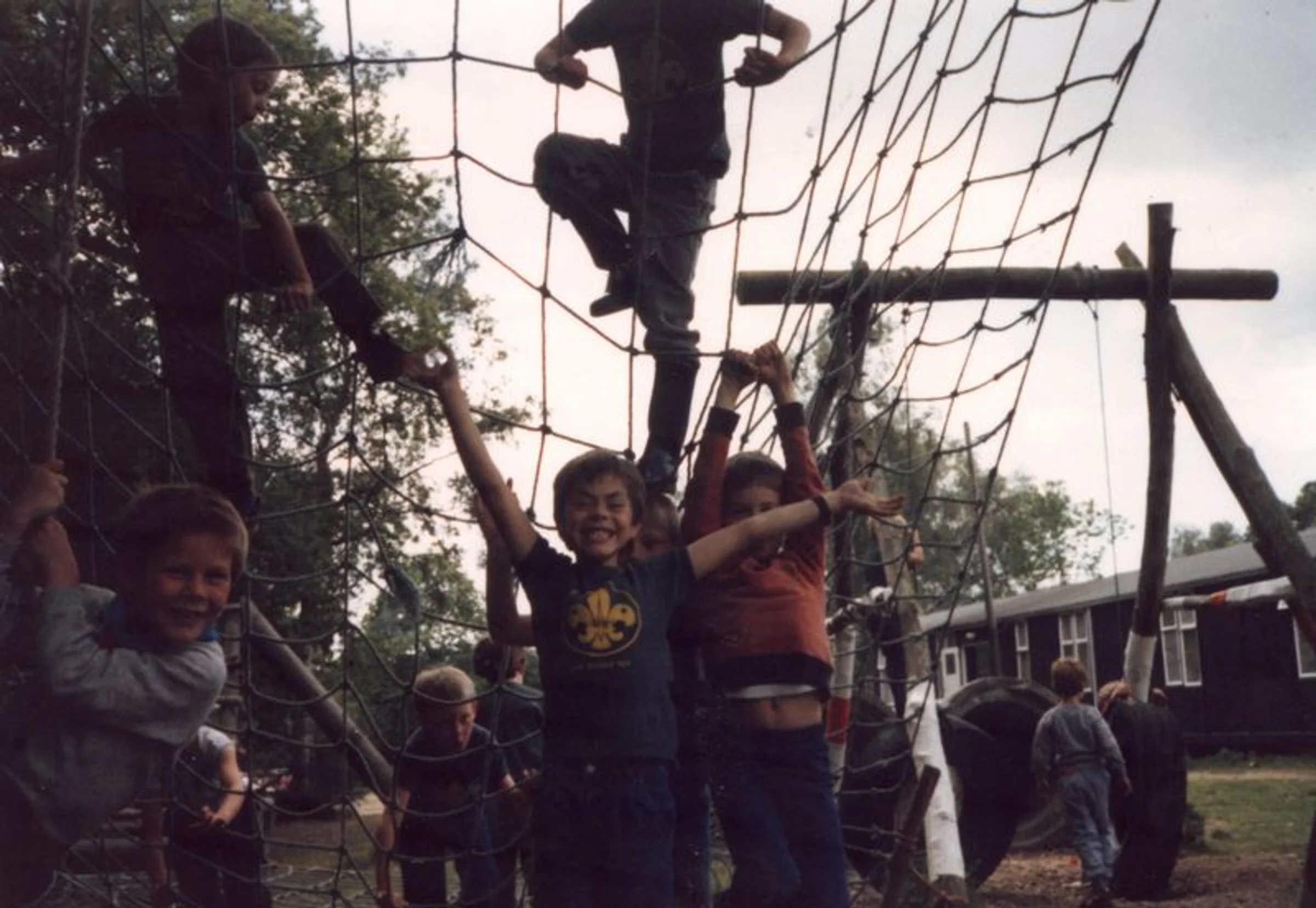 An undated photo of Beavers away on an adventure. There is a wooden building beyond and some of the boys are climbing netting.