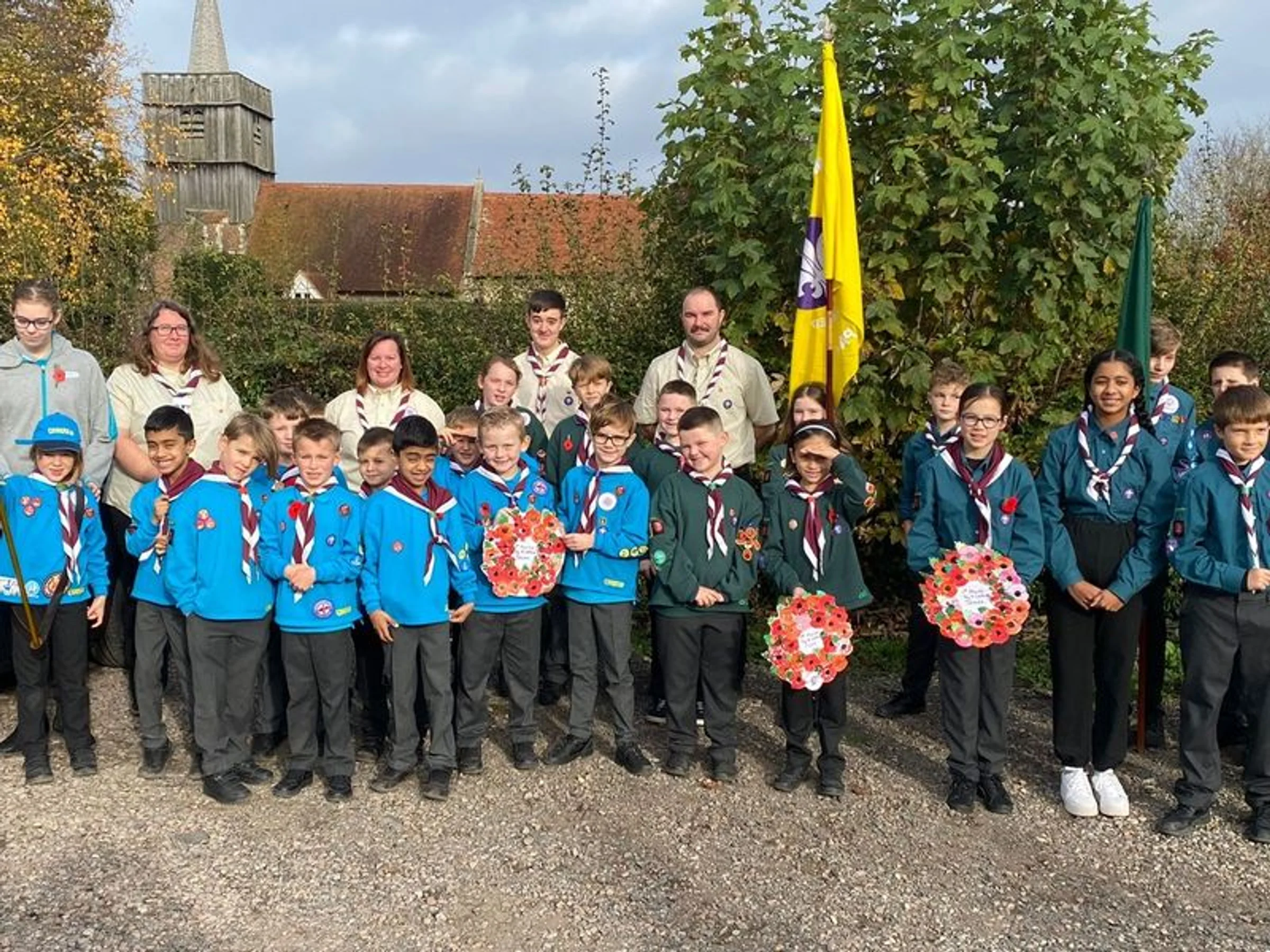 An undated photo of a group of young people in uniform with six leaders. There are two standards or flags and three wreaths. Behind is St Andrew's church, Marks Tey.
