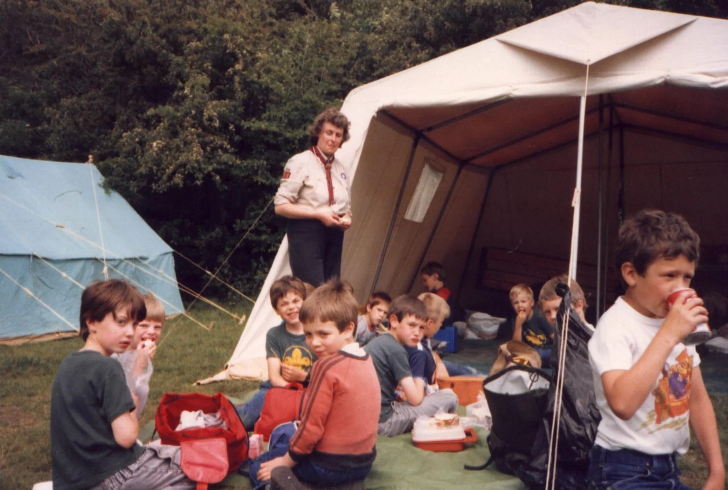 A group of Beavers sitting on the ground eating their packed lunches. Their leader, standing, may be Corinne Sermons. There is a pale brown tent behind her and a green tent to the left.