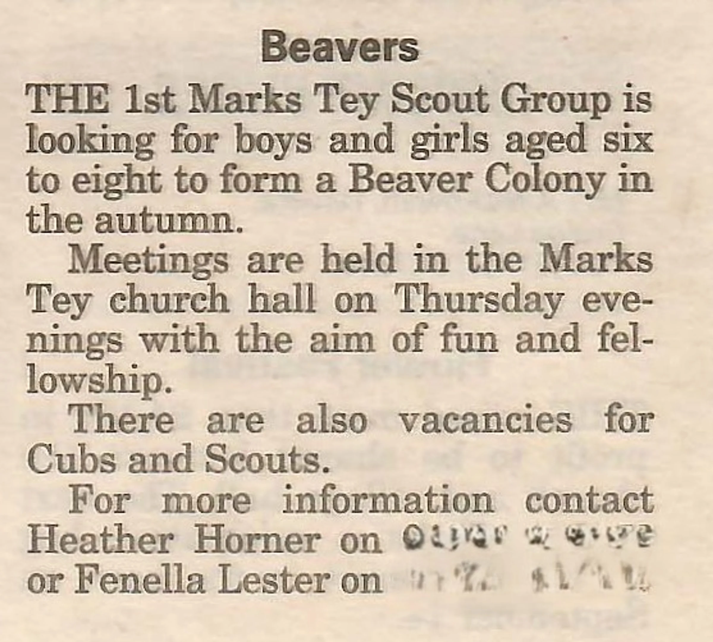 Village newspaper column reporting on a new Scout group Beaver colony.