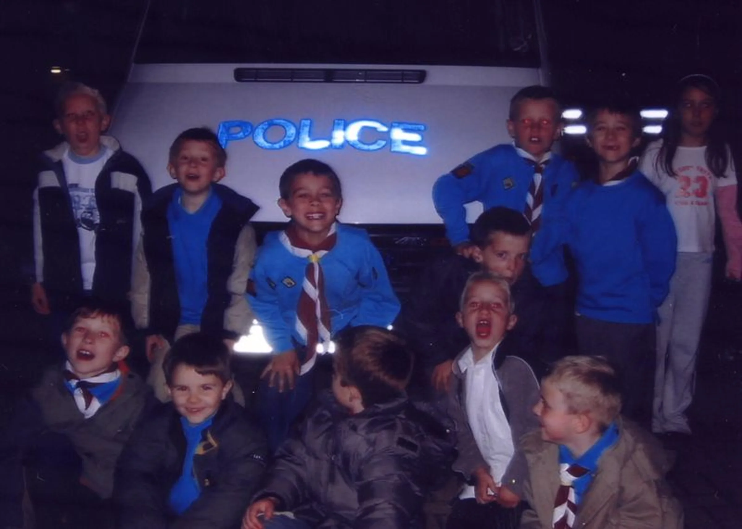 Undated photo of a group of Beavers visiting a Police vehicle.