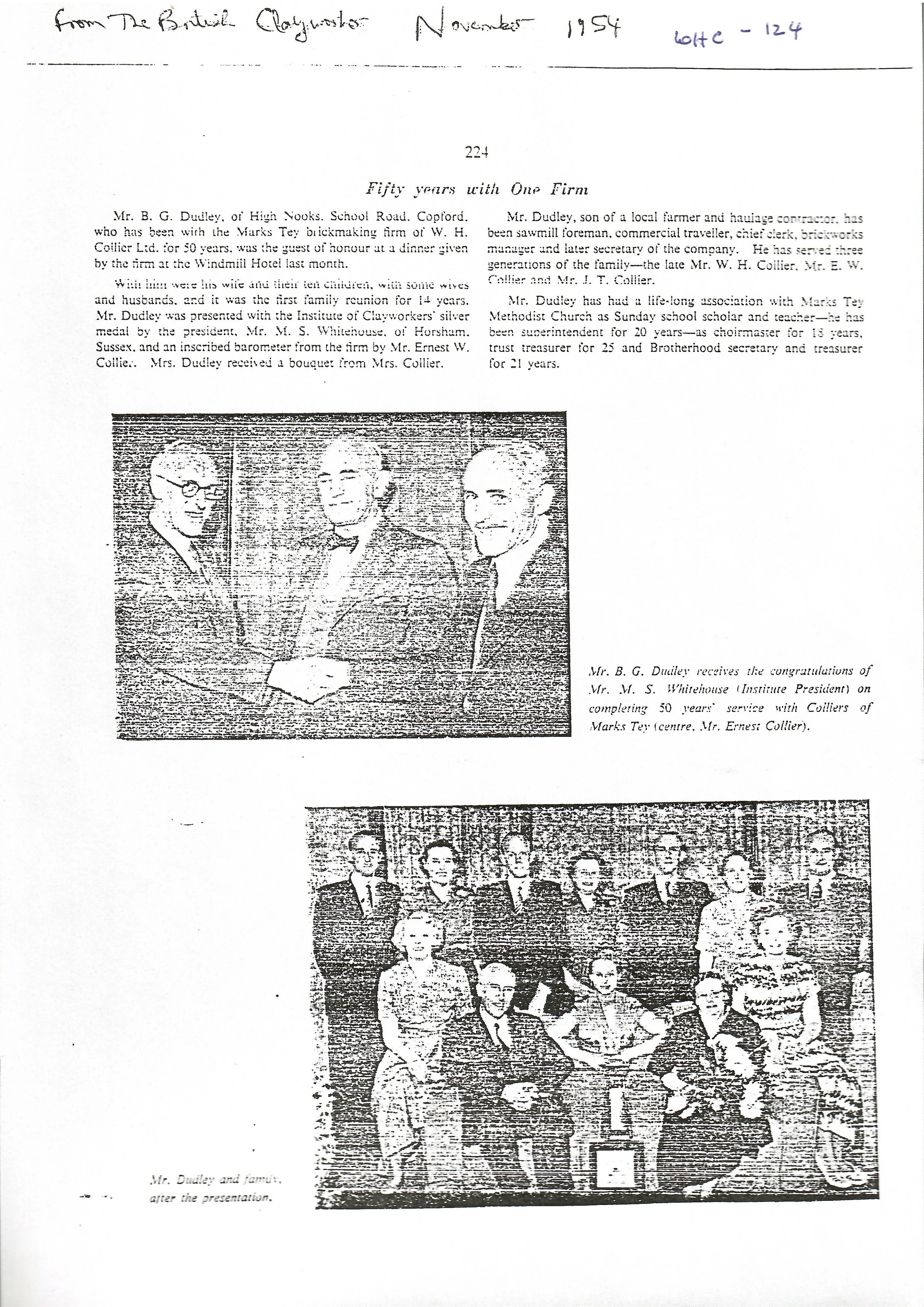 Short article describing the 50th anniversary of Bert Dudley working for W H Collier.