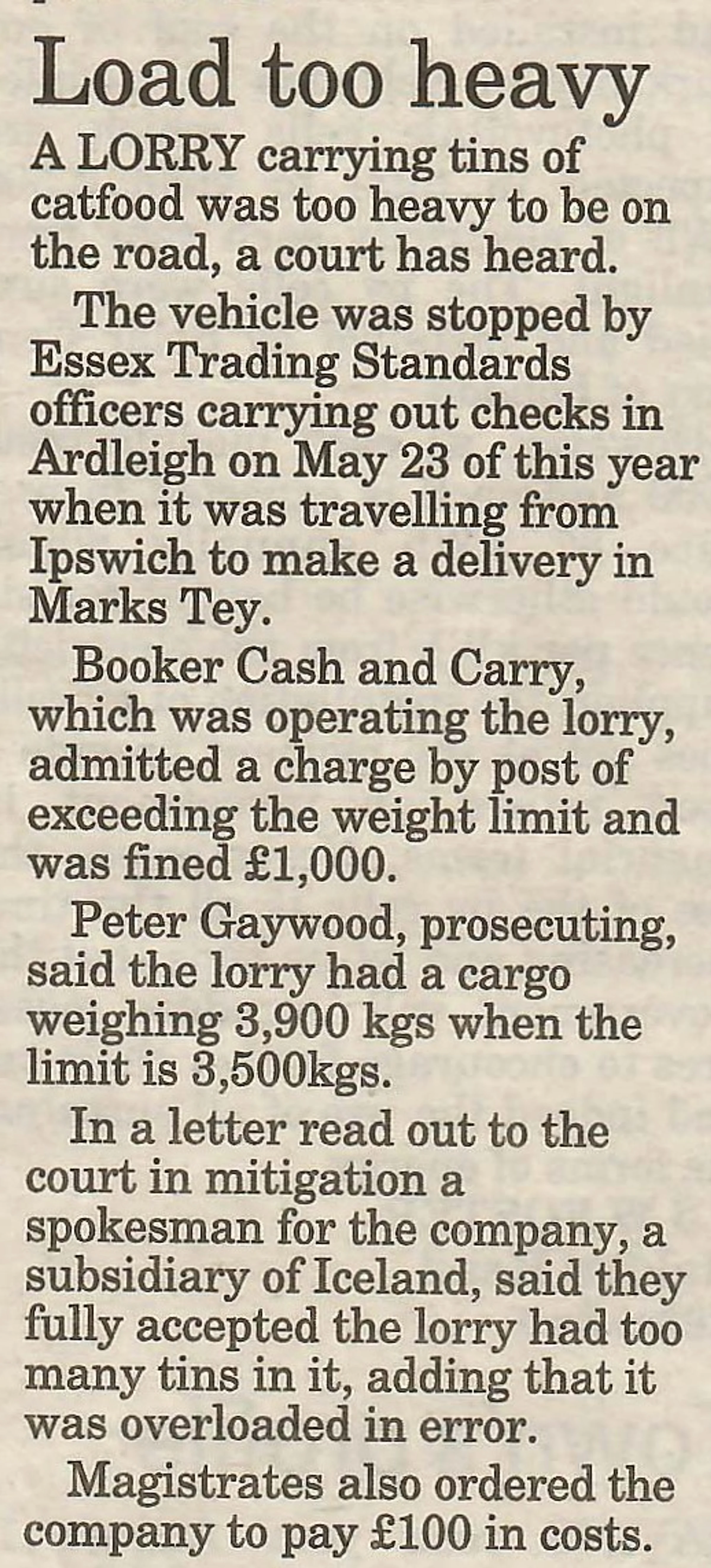 Newspaper report on a Essex Trading Standards case against a lorry delivering to Bookers Cash and Carry.
