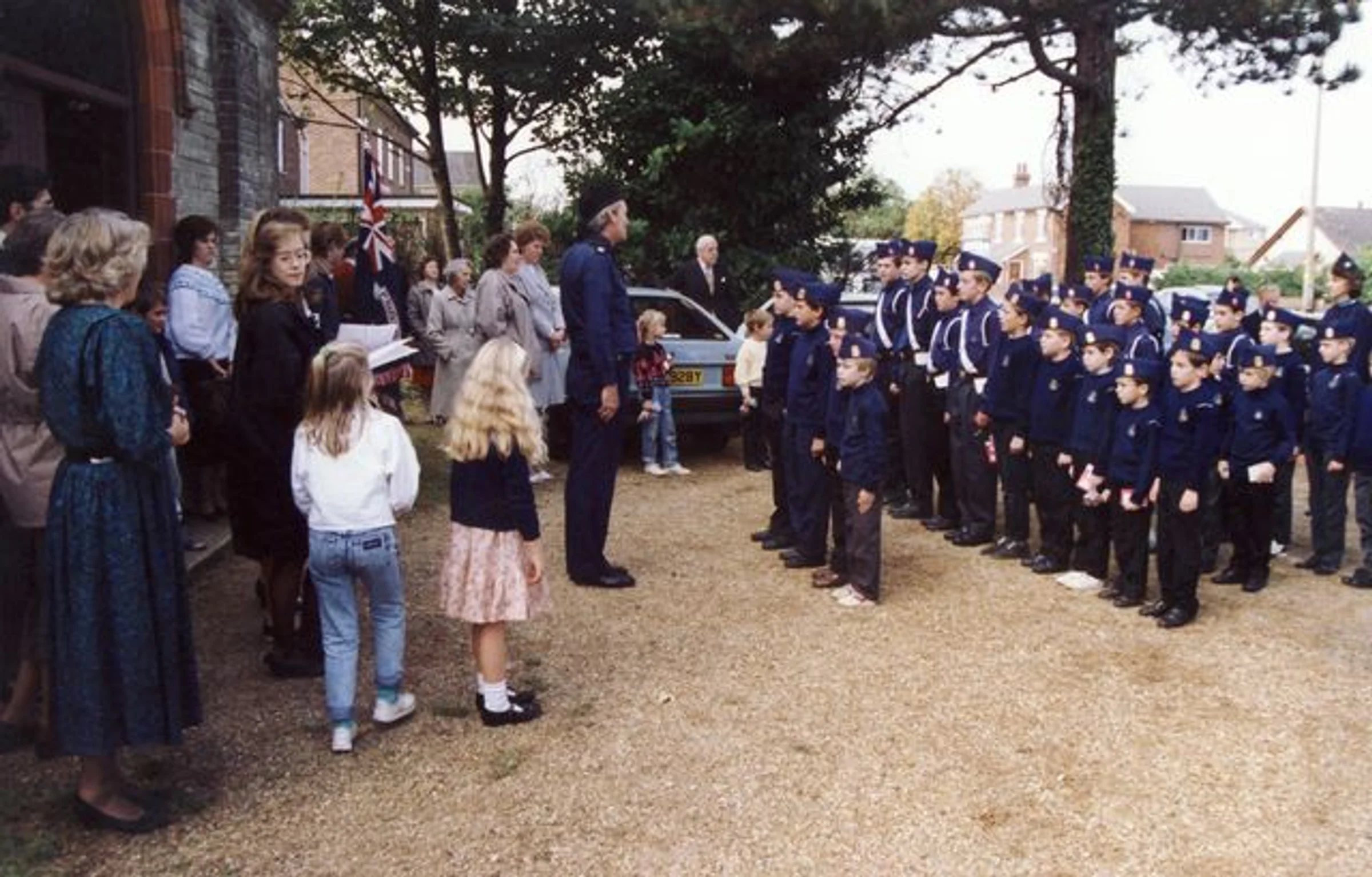 The Boys' Brigade outside the Church in London Road with parents and others watching.