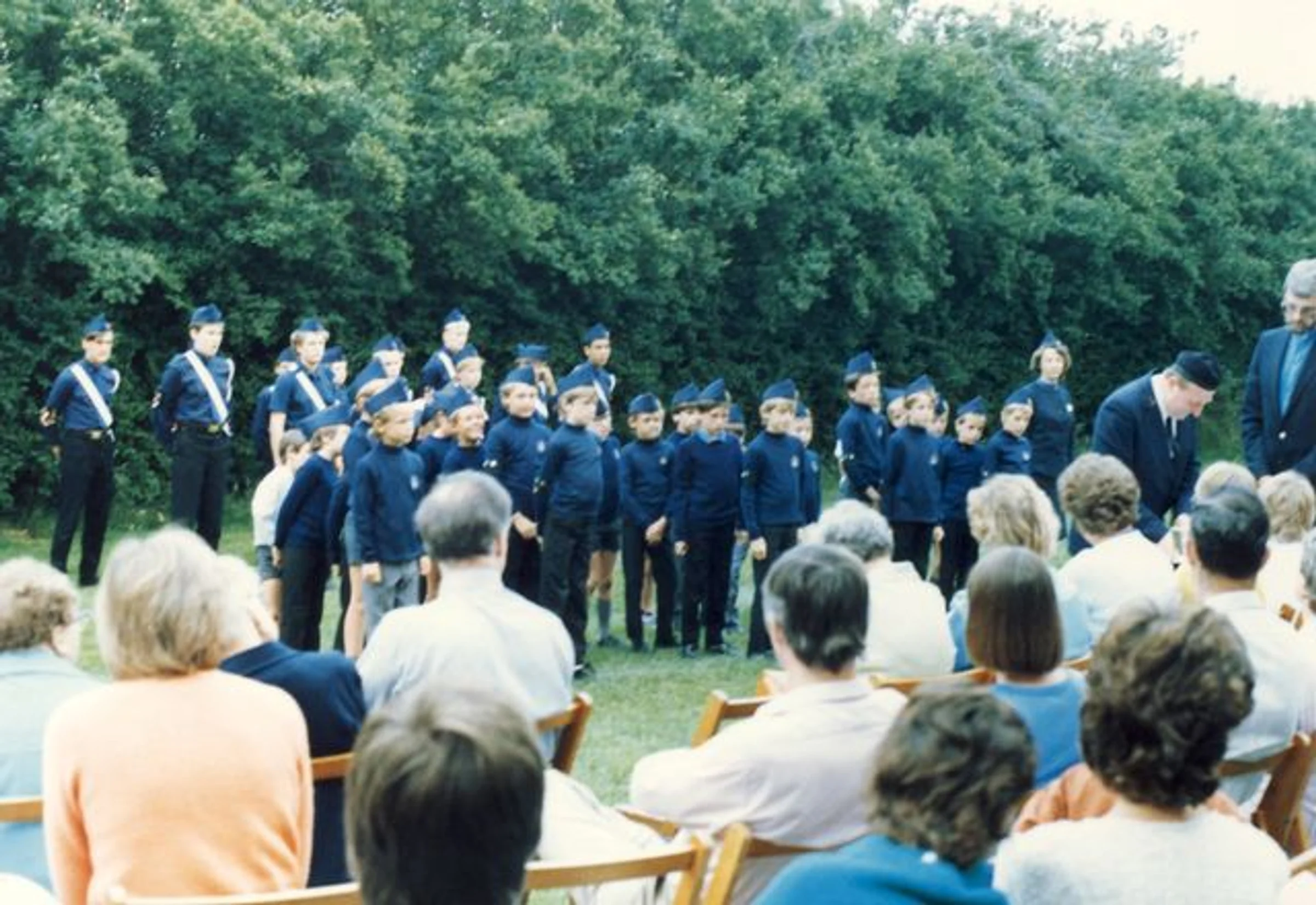 Two or three rows of boys all in Boys' Brigade uniforms. The congregation and parents are seated watching them. They may be outside the Methodist Church.