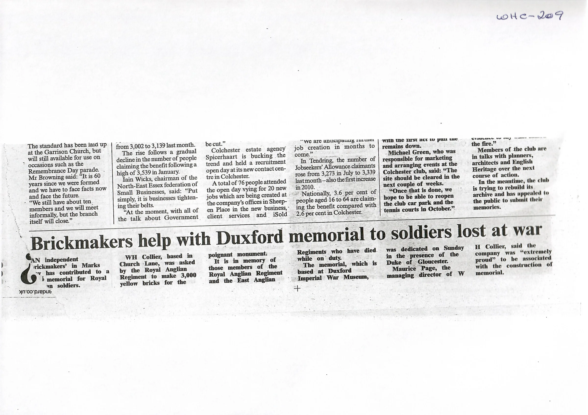Cutting describing W H Collier's involvement in the Duxford War Memorial.