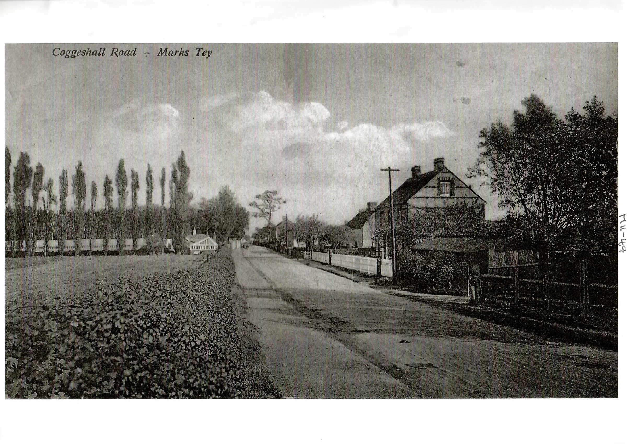 An undated postcard looking down Coggeshall Road to Bridge Farm (now close to the roundabout). The row of poplars on the left is a feature. The nursery on that side of the road could have been Buntings which was where Flyover Nurseries was later.