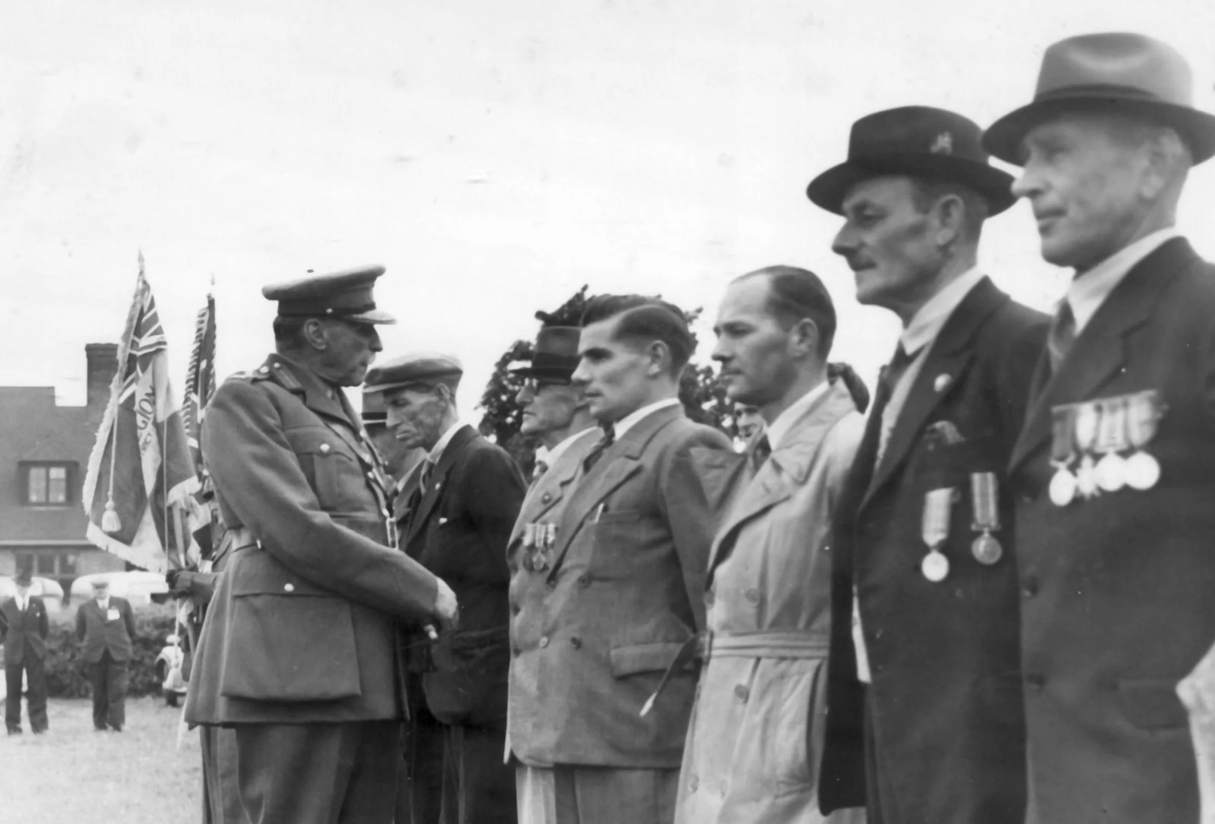 An undated black & white photo of a man in a military uniform greeting other men, some wearing medals. Could the building beyond be the Prince of Wales pub?