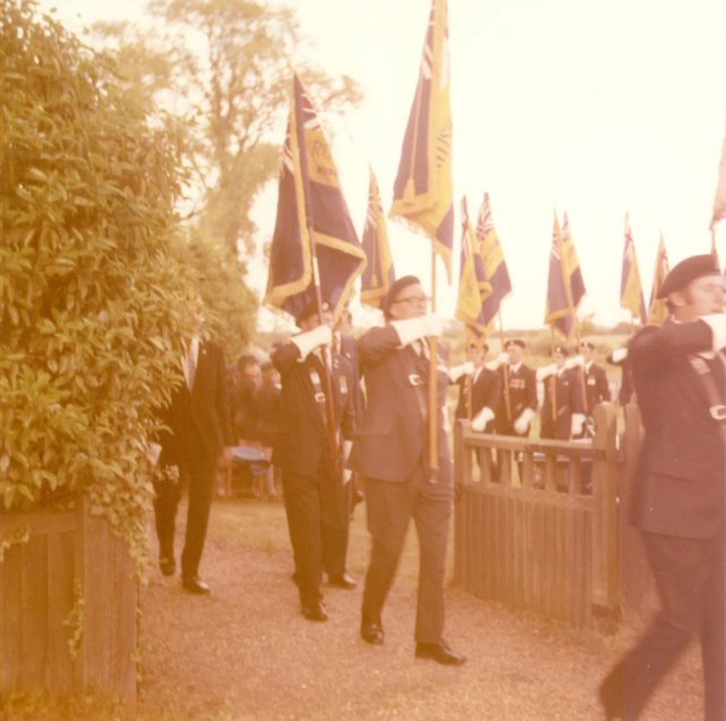Undated photo of the British Legion at a Remembrance service. The standard bearers are passing through the gates of St Andrew's church.