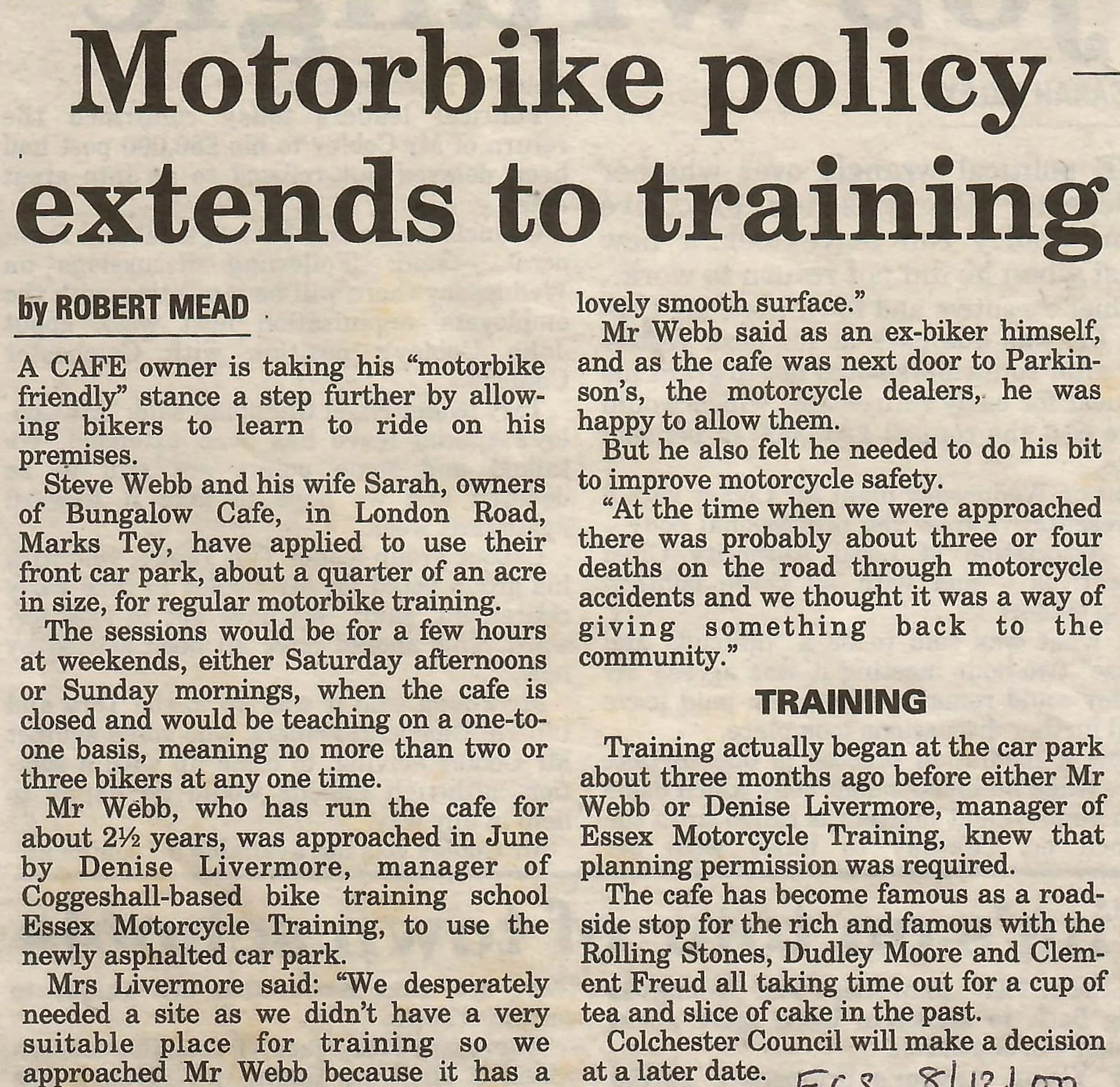 Newspaper article reporting on motorbike training at the Bungalow Cafe.