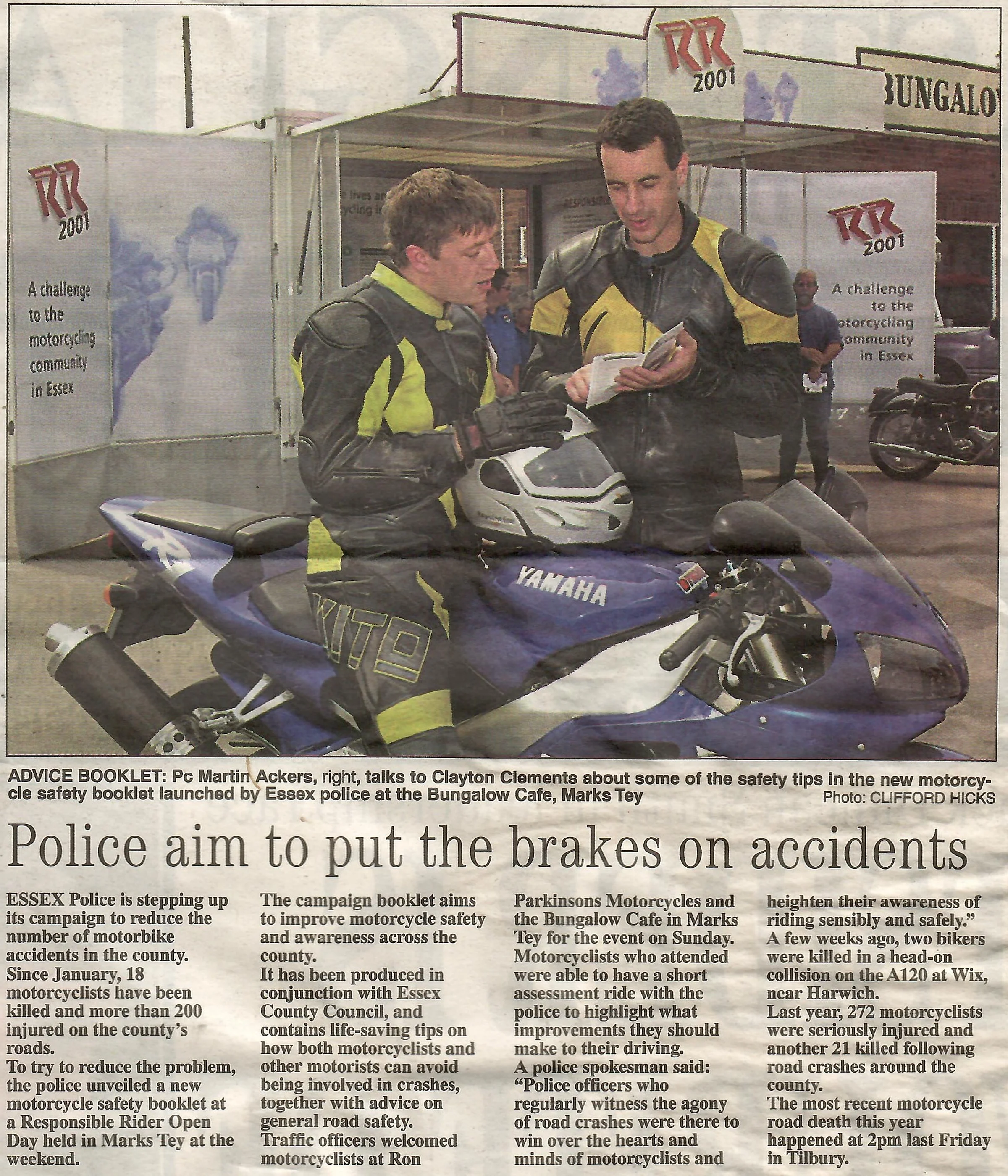 Newspaper photograph and report regarding an Essex Police campaign for motorbike safety, held at the Bungalow Cafe and Ron Parkinsons.