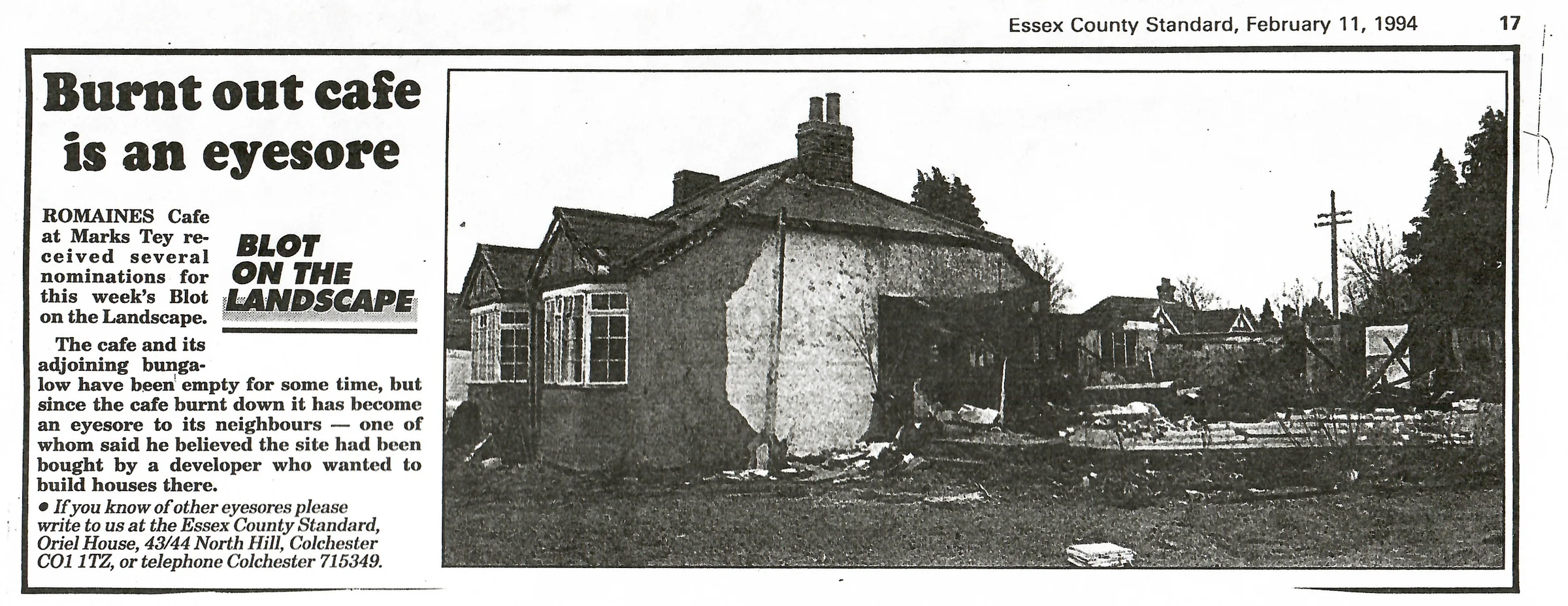 Romaines Cafe at Marks Tey has received several nominations for this week's Blot on the Landscape. The cafe and its adjoining bungalow have been empty for some time, but since the cafe burnt down it has become an eyesore to its neighbours - one of whom said he believed the site had been bought by a developer who wanted to build houses there.