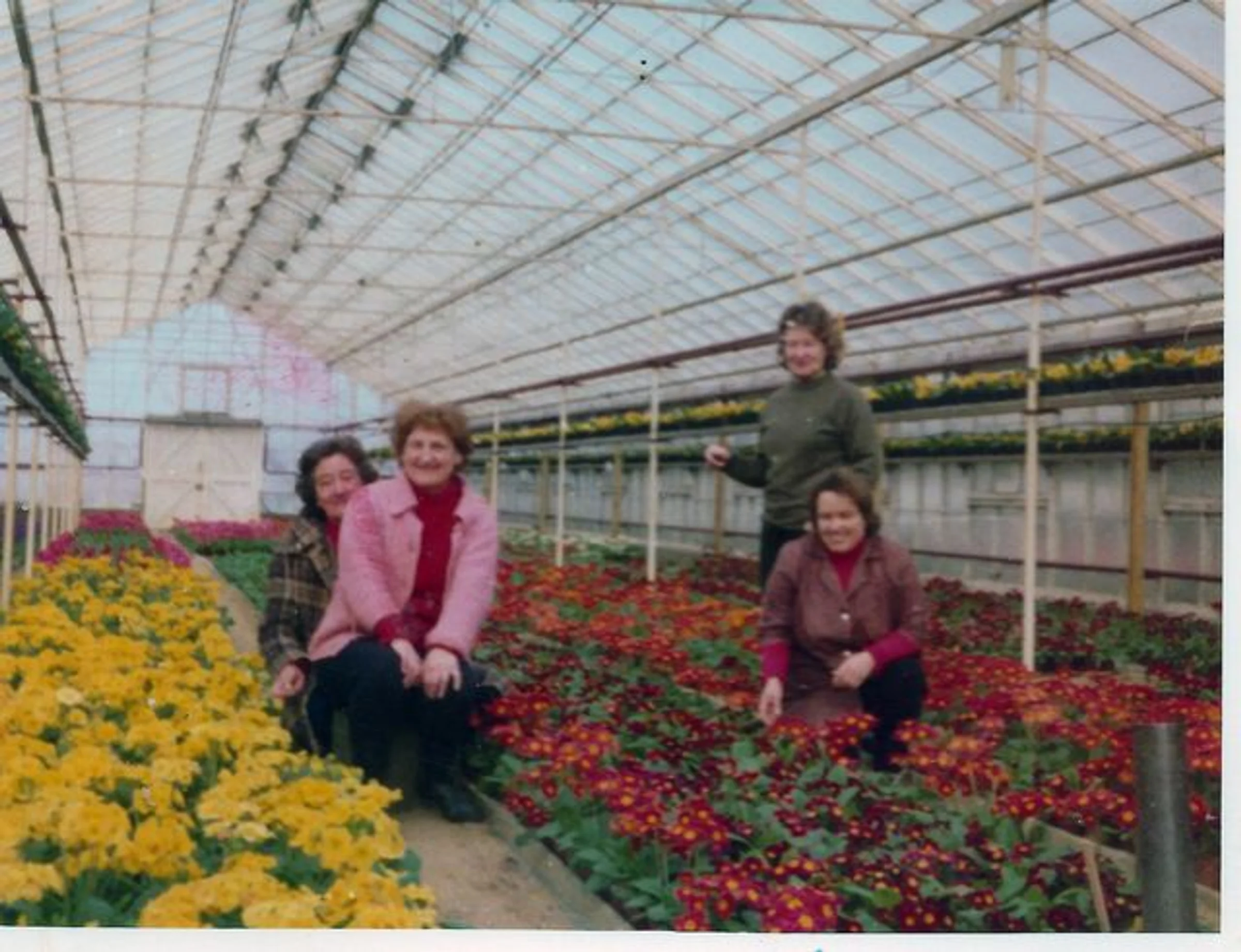 Undated colour photo of four ladies in a greenhouse with rows of yellow and red flowers.