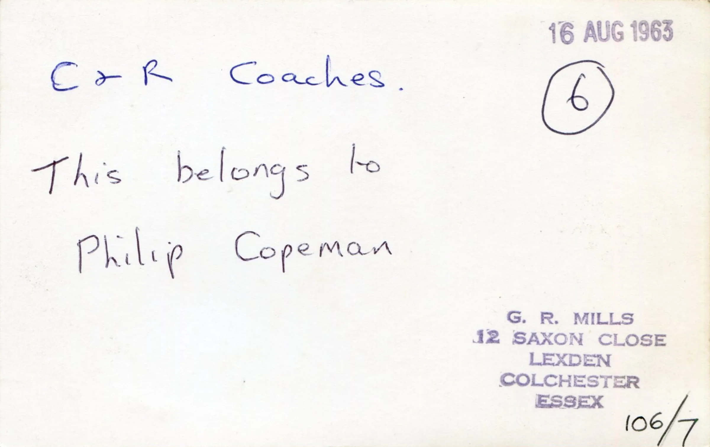 The reverse of a photograph of a bus and three coaches in a building in Church Lane, Little Tey owned by Philip Copeman. The photo was dated 16 August 1963 and was taken by G & R Mills of 12 Saxon Close, Lexden.