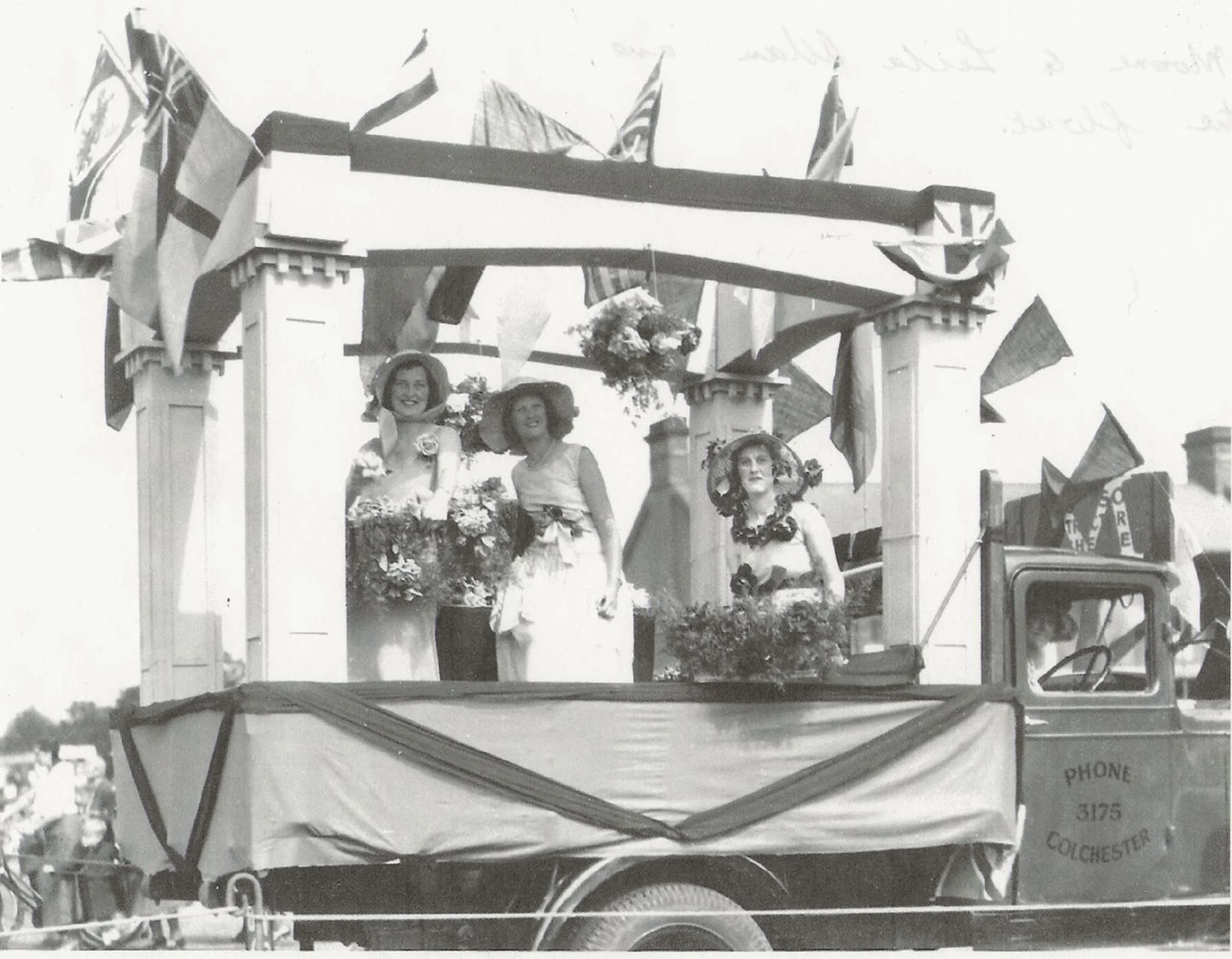 This could be a Dobbies photo and the girls on the carnival float Dobbies staff. Maybe it can be confirmed by the telephone number of Colchester 3175 on the door of the vehicle?