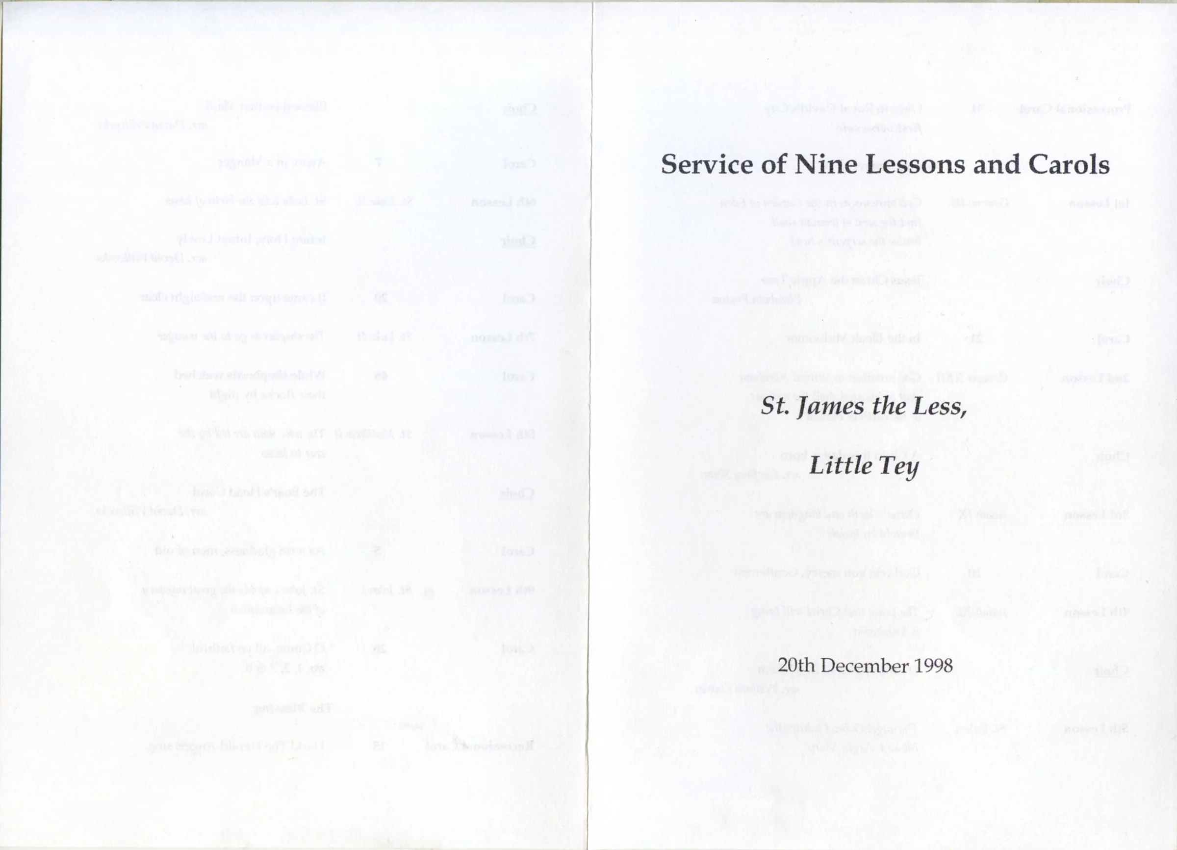 A service sheet for the carols and choir items sung at the Service of Nine Lessons and Carols at Little Tey church on 20 December 1998.