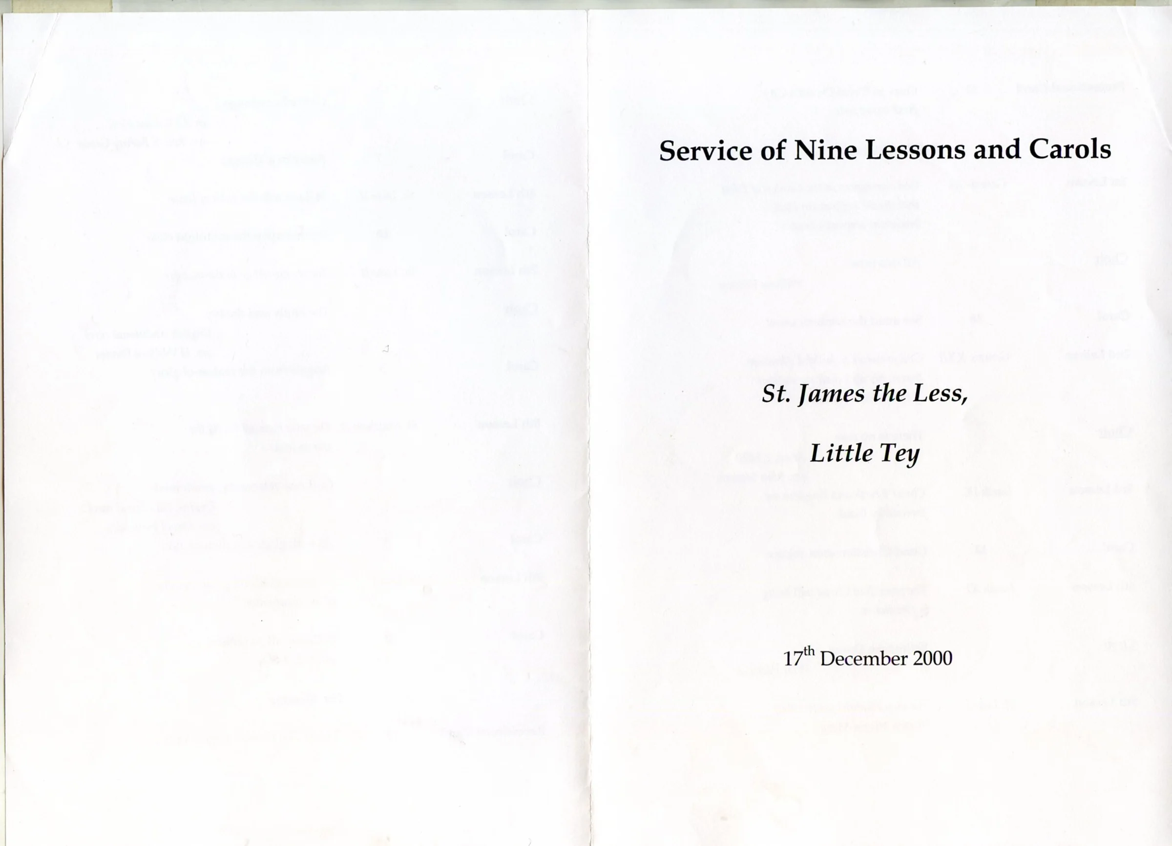 A service sheet for the carols and choir items sung at the Service of Nine Lessons and Carols at Little Tey church on 17 December 2000.