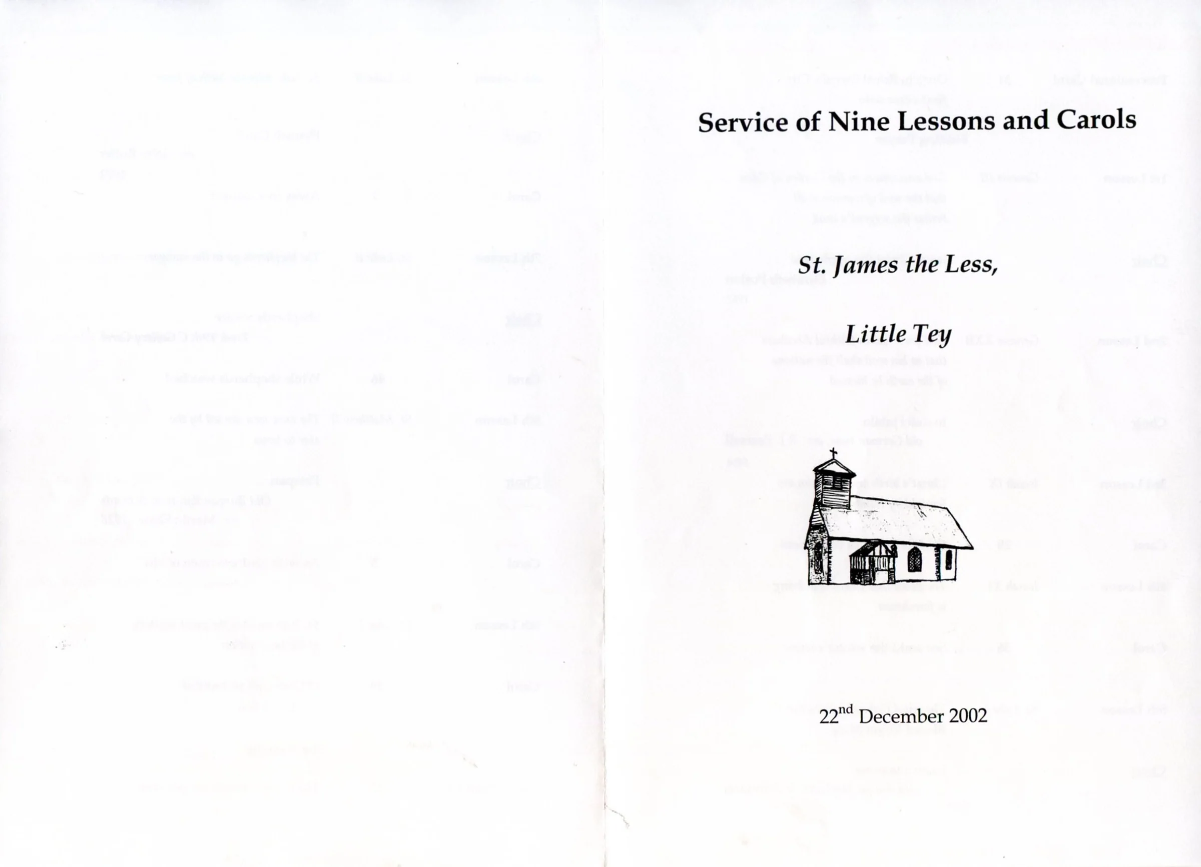A service sheet for the carols and choir items sung at the Service of Nine Lessons and Carols at Little Tey church on 22 December 2002.
