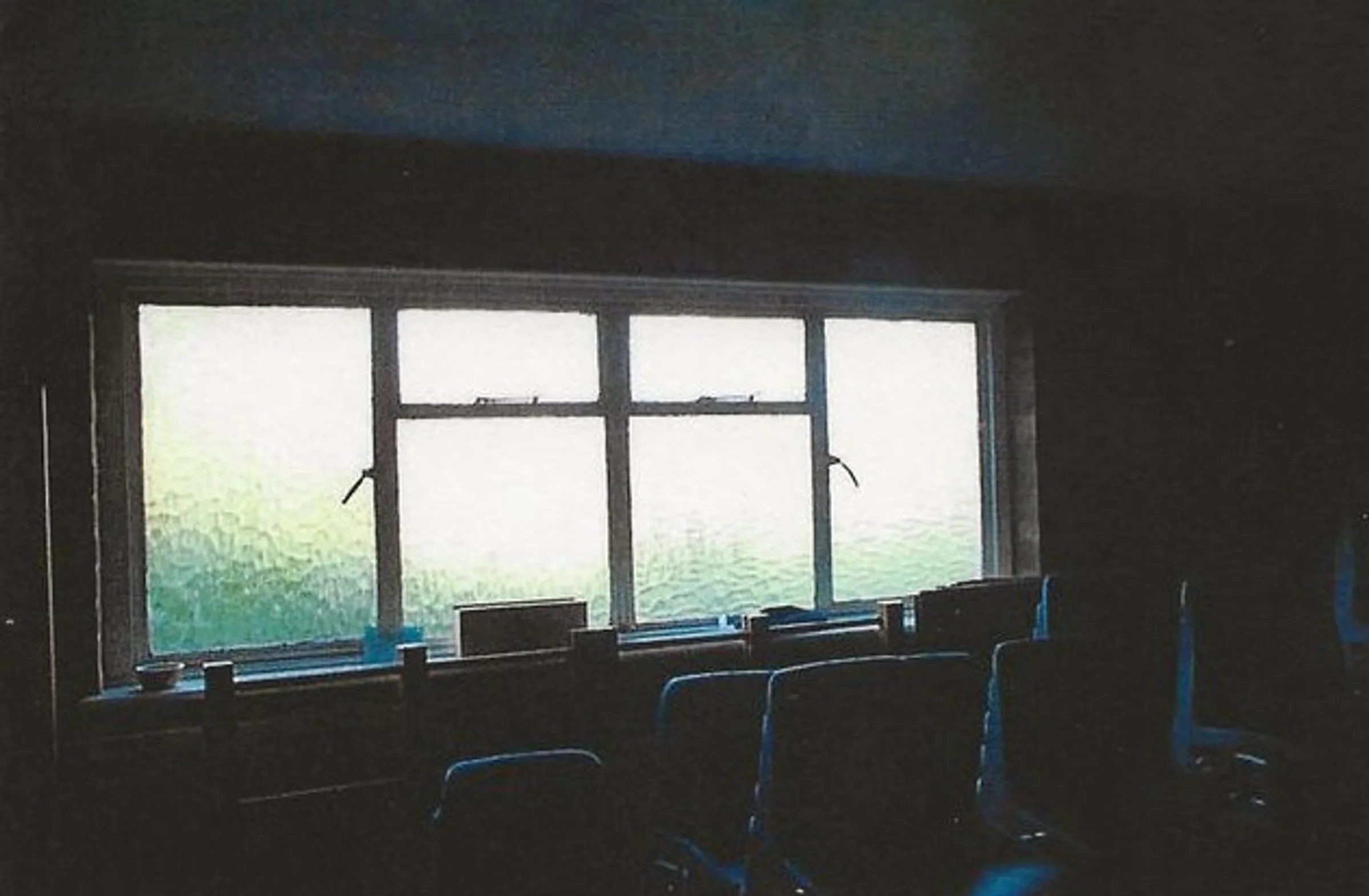Photograph of the window behind stacked chairs, to be changed to clear glass.