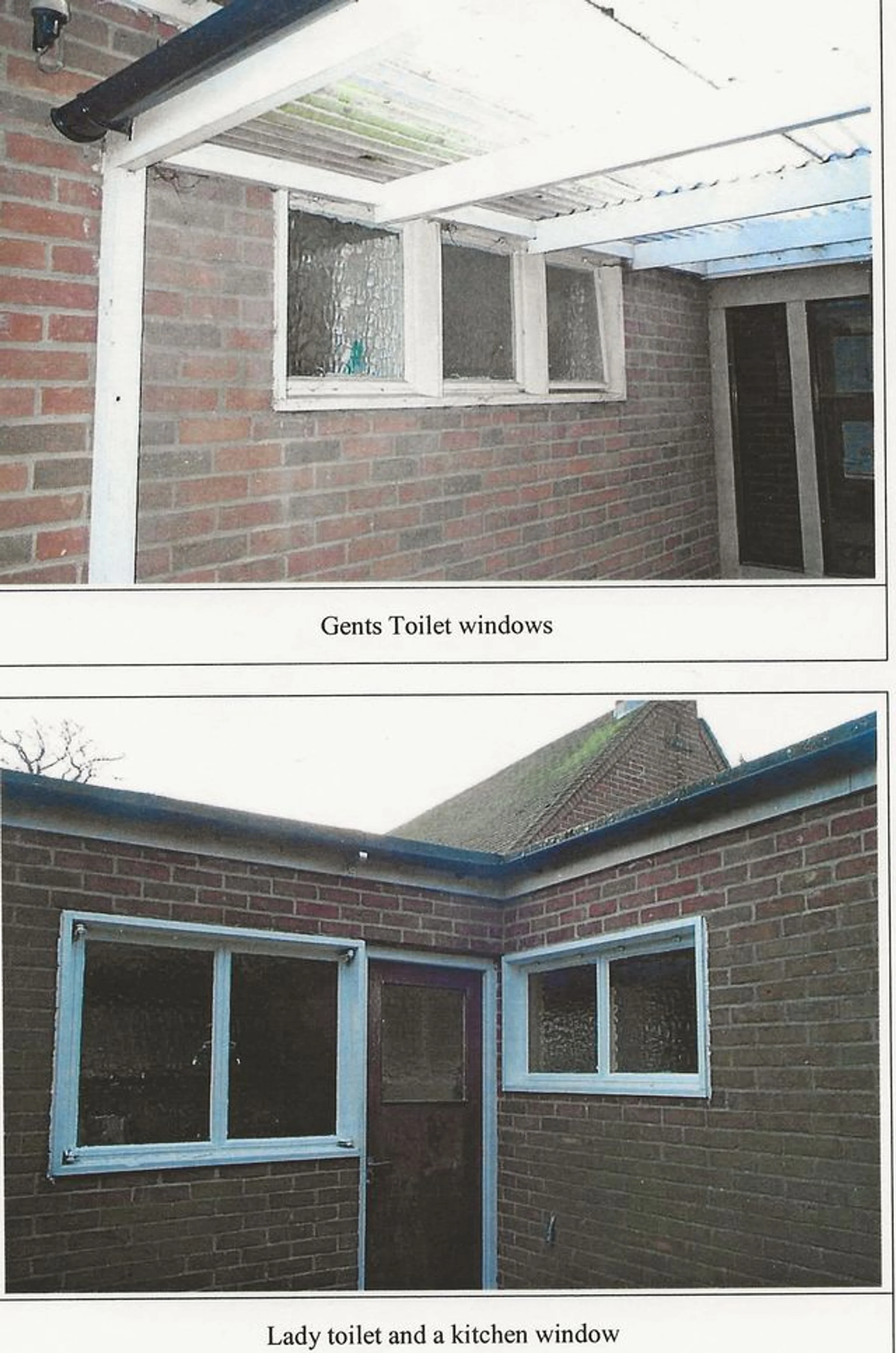 Two photographs of external views of Church Hall windows; the first looking northeast labelled "Gents Toilet windows", and the second looking southeast and labelled "Lady toilet and a kitchen window".