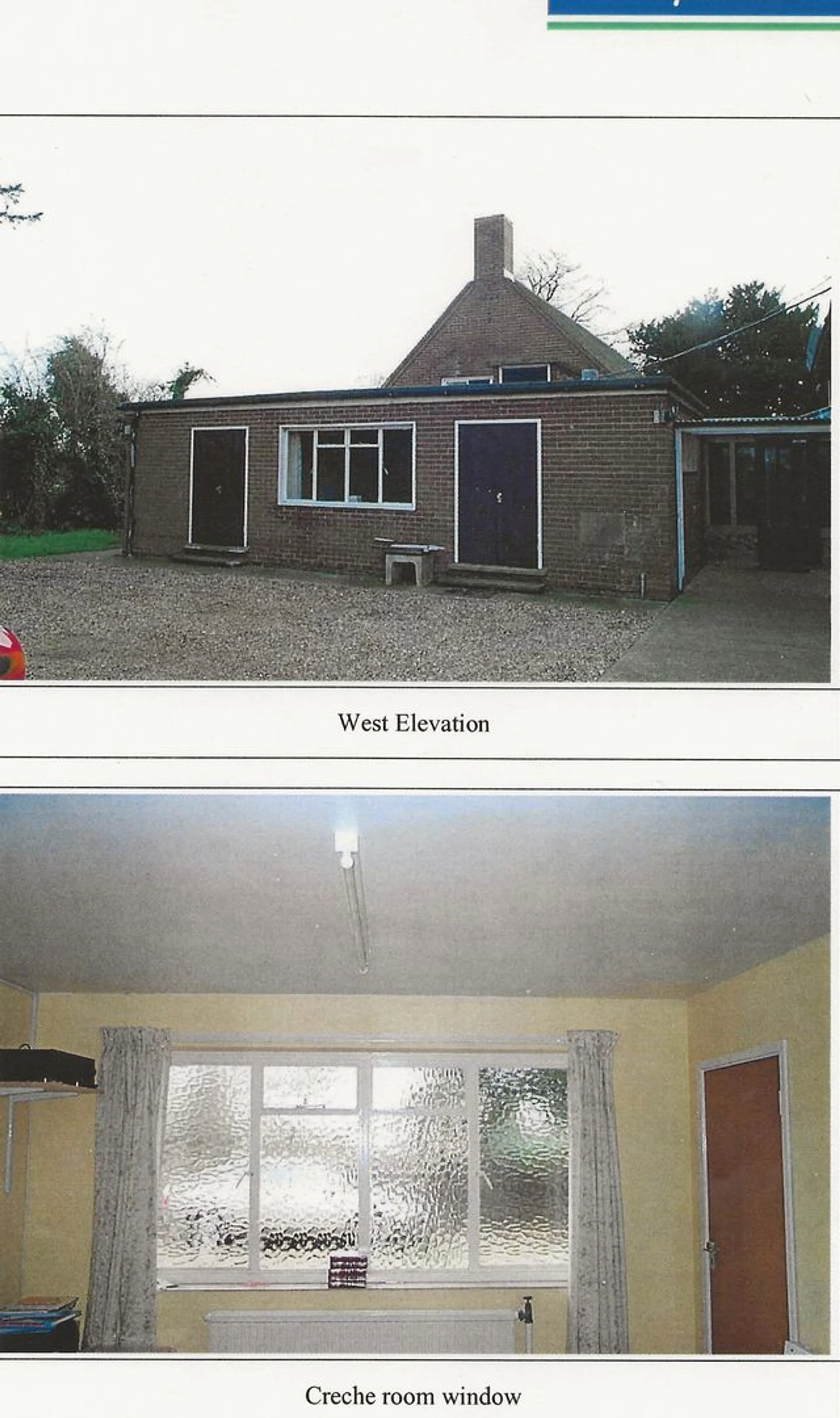 Two photographs, the first an external view looking east showing the "West Elevation". The second is inside and labelled "Creche room window".